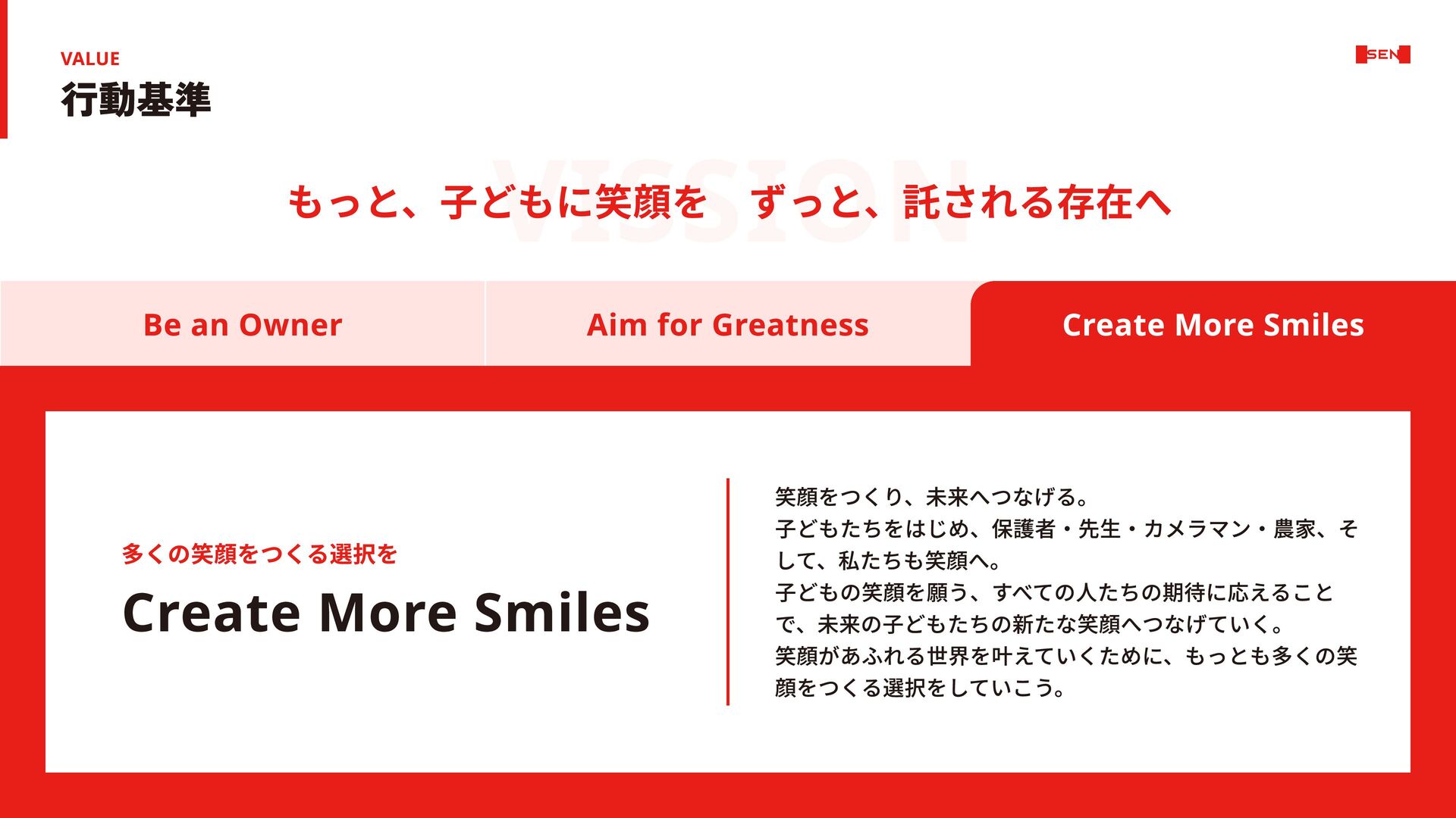 Create More Smiles 笑顔をつくり、未来へつなげる。 子どもたちをはじめ、保護者・先生・カメラマン・農家、そ して、私たちも笑顔へ。 子どもの笑顔を願う、すべての人たちの期待に応えること で、未来の子どもたちの新たな笑顔へつなげていく。 笑顔があふれる世界を叶えていくために、もっとも多くの笑 顔をつくる選択をしていこう。 VALUE 行動基準 もっと、子どもに笑顔を ずっと、託される存在へ
