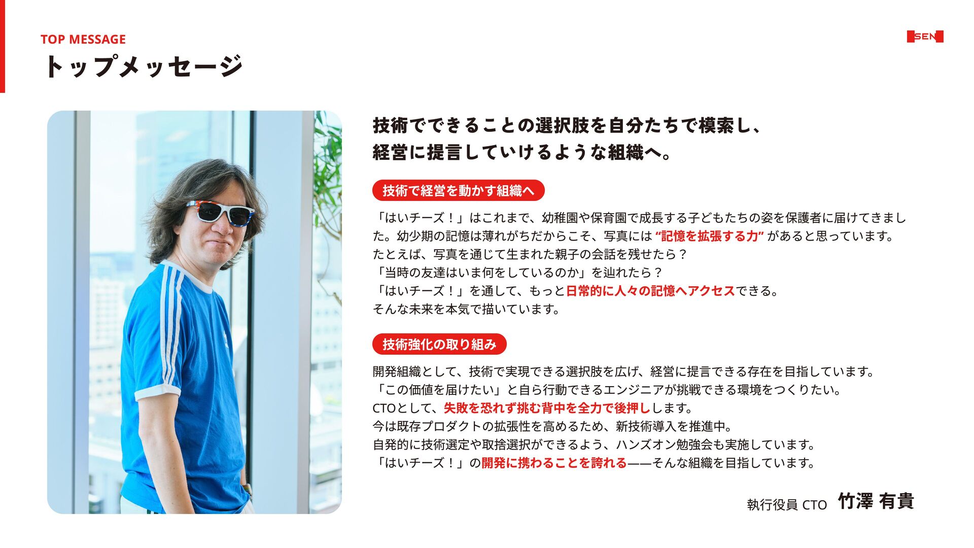 「当時の友達はいま何をしているのか」を辿れたら? 「はいチーズ!」を通して、もっと できる。 そんな未来を本気で描いています。 “記憶を拡張する力” 日常的に人々の記憶へアクセス 技術強化の取り組み 開発組織として、技術で実現できる選択肢を広げ、経営に提言できる存在を目指しています。 「この価値を届けたい」と自ら行動できるエンジニアが挑戦できる環境をつくりたい。 CTOとして、 します。 今は既存プロダクトの拡張性を高めるため、新技術導入を推進中。 自発的に技術選定や取捨選択ができるよう、ハンズオン勉強会も実施しています。 「はいチーズ!」の ――そんな組織を目指しています。 失敗を恐れず挑む背中を全力で後押し 開発に携わることを誇れる 執行役員 CTO 竹澤 有貴