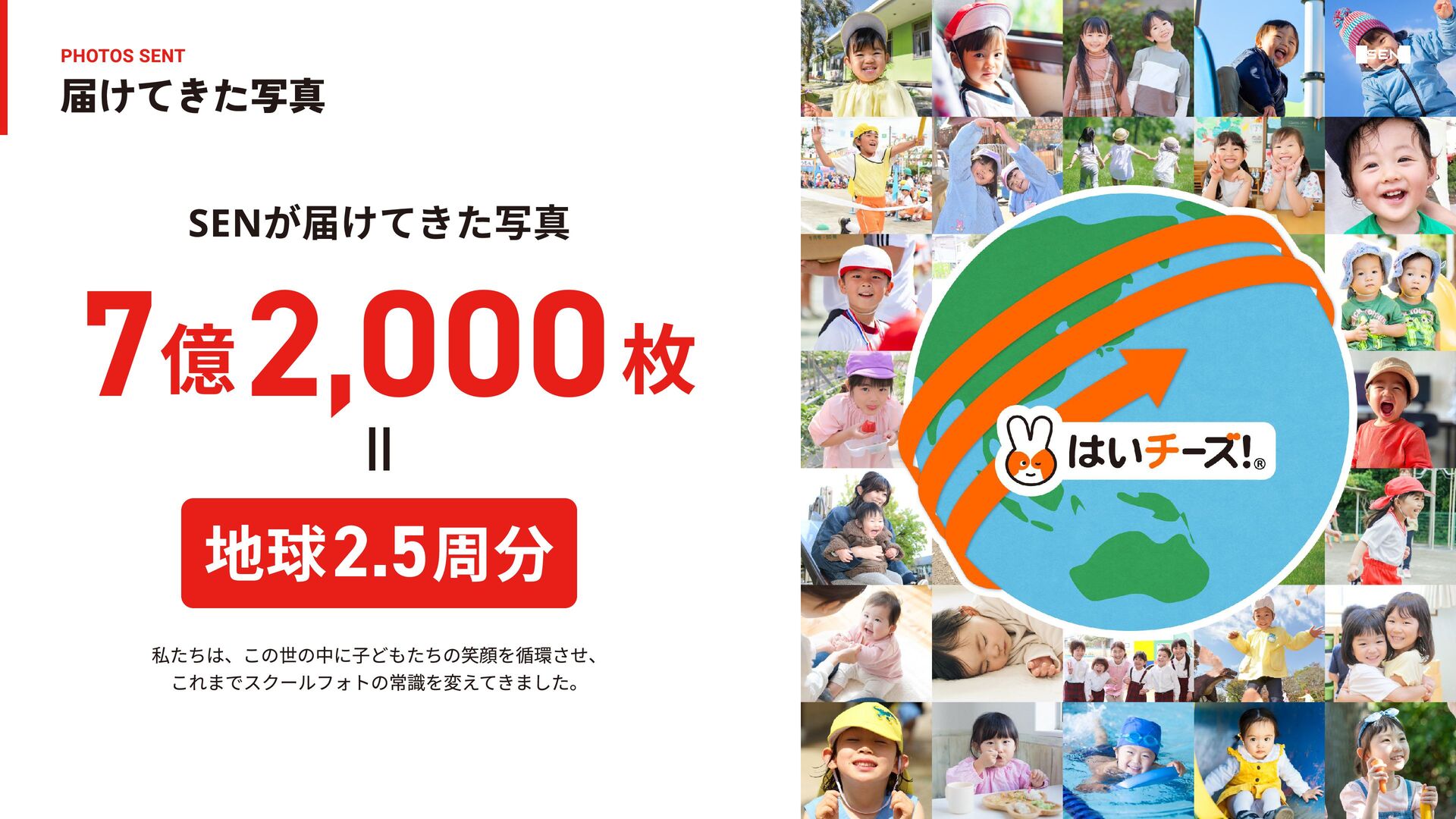 SENが届けてきた写真 = 7億 2,000枚 私たちは、この世の中に子どもたちの笑顔を循環させ、 これまでスクールフォトの常識を変えてきました。 地球2.5周分 Photos sent 届けてきた写真