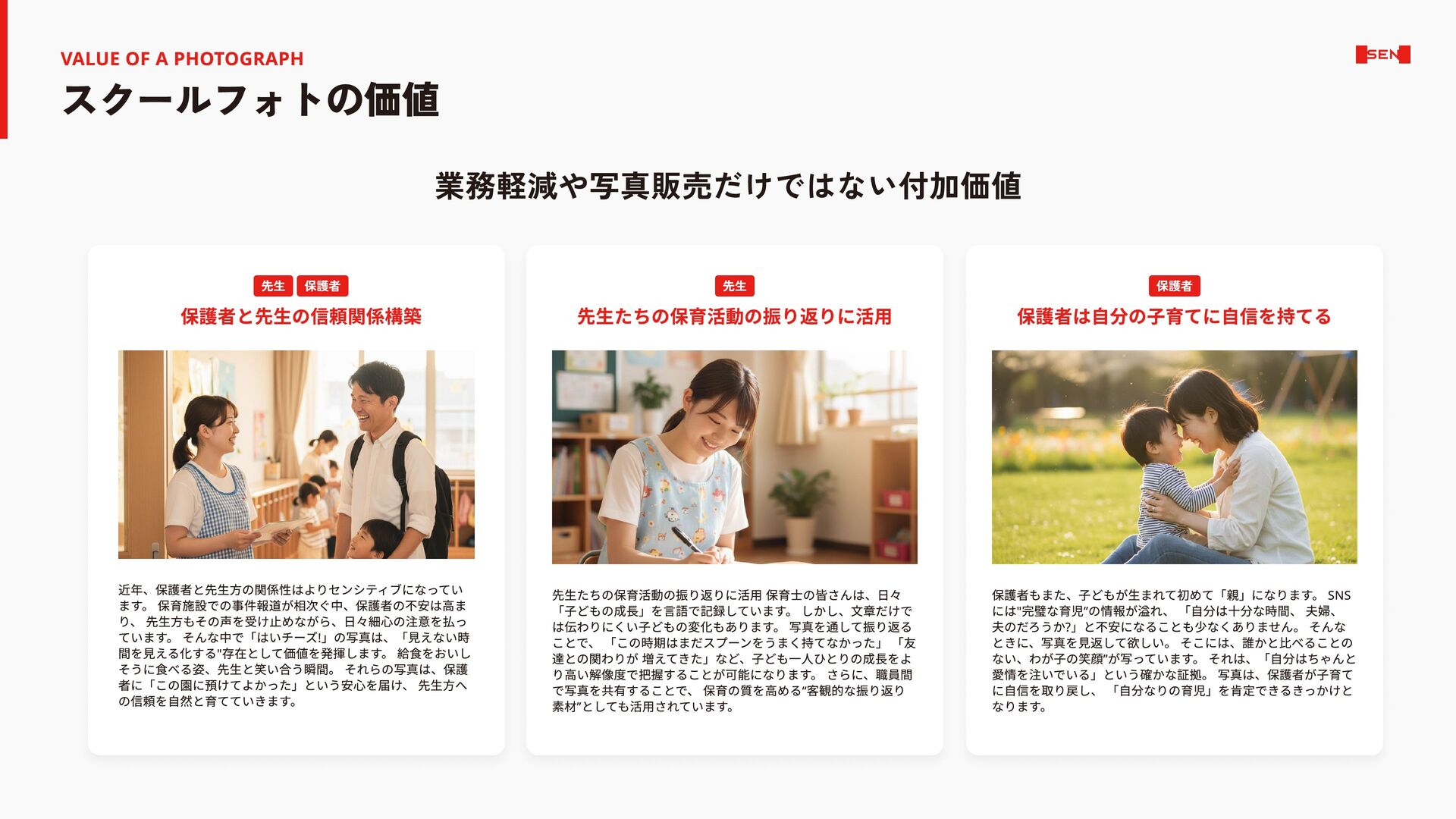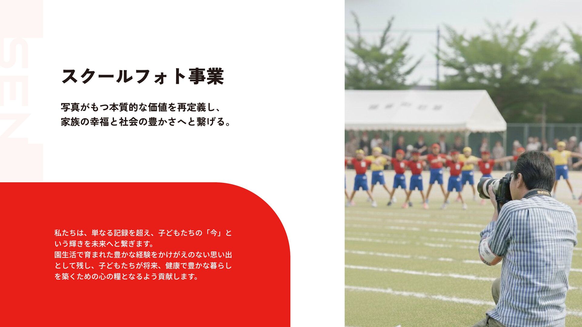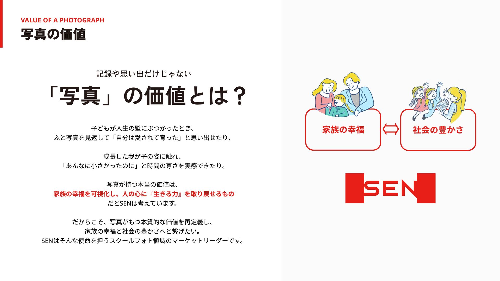 壁に ぶつかった とき、 ふと 写真を 見返して 「自分は 愛されて 育った」と 思い出せたり、 成長した 我が 子の 姿に 触れ、 「あんなに 小さかったのに」と 時間の 尊さを 実感できたり。 写真が 持つ 本当の 価値は、 だとSENは考えています。 だからこそ、写真が もつ本質的な 価値を 再定義し、 家族の 幸福と 社会の 豊かさへと繋げたい。 SENはそんな 使命を 担うスクールフォト領域の マーケットリーダーです。 家族の 幸福を 可視化し、人の 心に 『生きる 力』を 取り戻せるもの 家族の幸福 社会の豊かさ