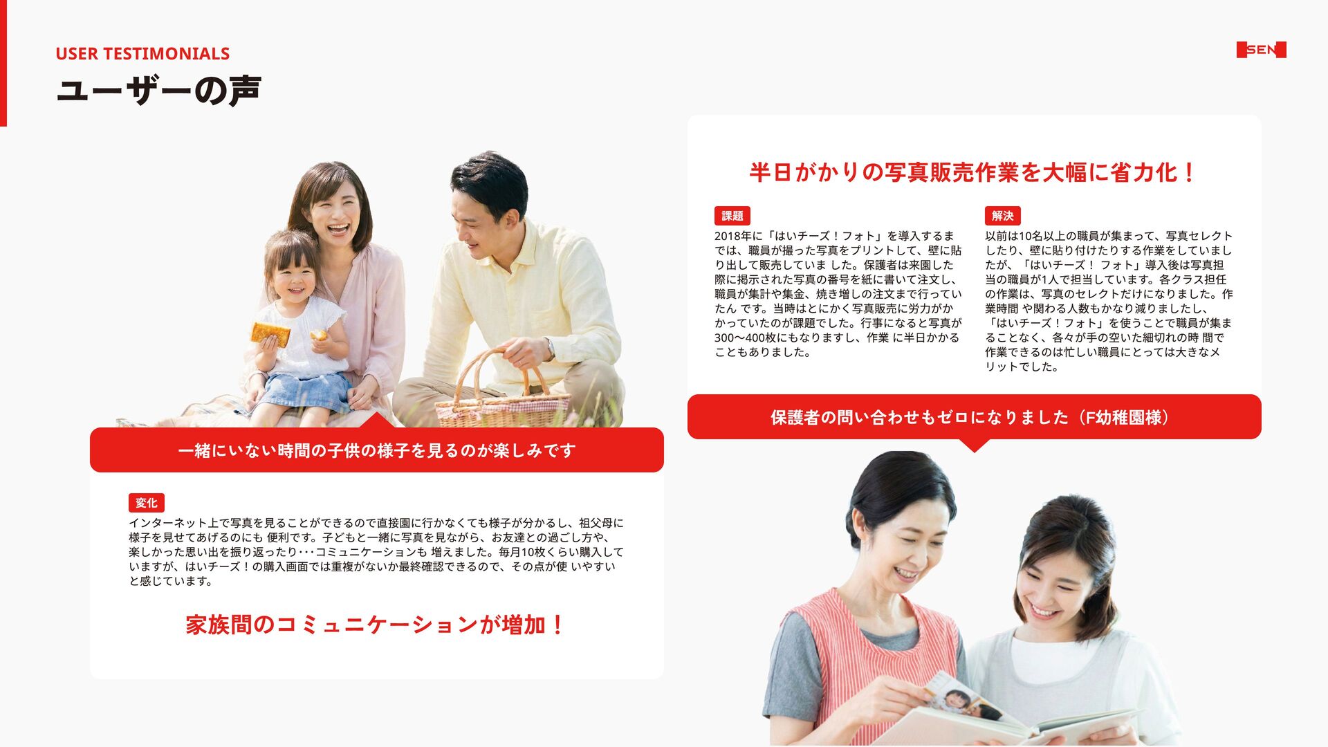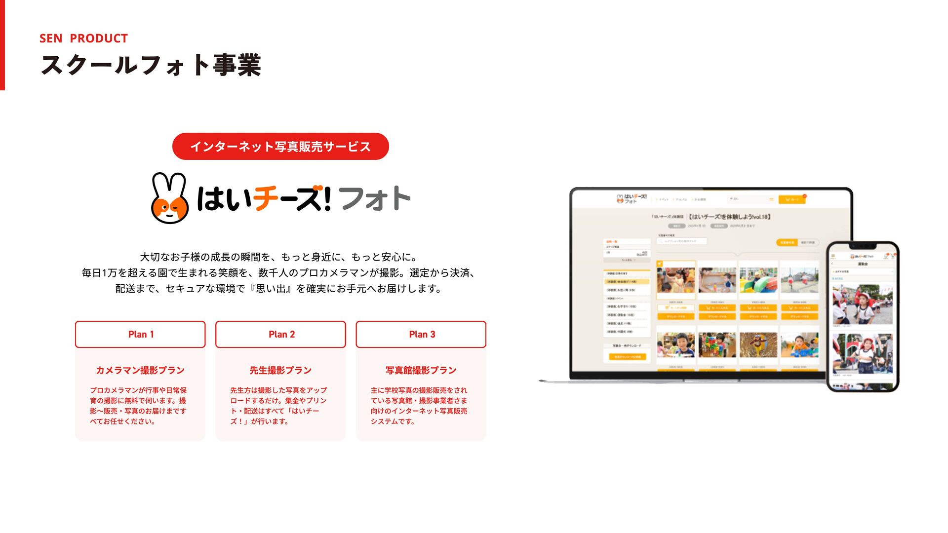 べてお任せください。 カメラマン撮影プラン プロカメラマンが行事や日常保 育の撮影に無料で伺います。撮 影~販売・写真のお届けまです べてお任せください。 Plan 2 先生撮影プラン 先生方は撮影した写真をアップ ロードするだけ。集金やプリン ト・配送はすべて「はいチー ズ!」が行います。 先生撮影プラン 先生方は撮影した写真をアップ ロードするだけ。集金やプリン ト・配送はすべて「はいチー ズ!」が行います。 Plan 3 写真館撮影プラン 主に学校写真の撮影販売をされ ている写真館・撮影事業者さま 向けのインターネット写真販売 システムです。 写真館撮影プラン 主に学校写真の撮影販売をされ ている写真館・撮影事業者さま 向けのインターネット写真販売 システムです。 SEN PRODUCT スクールフォト事業