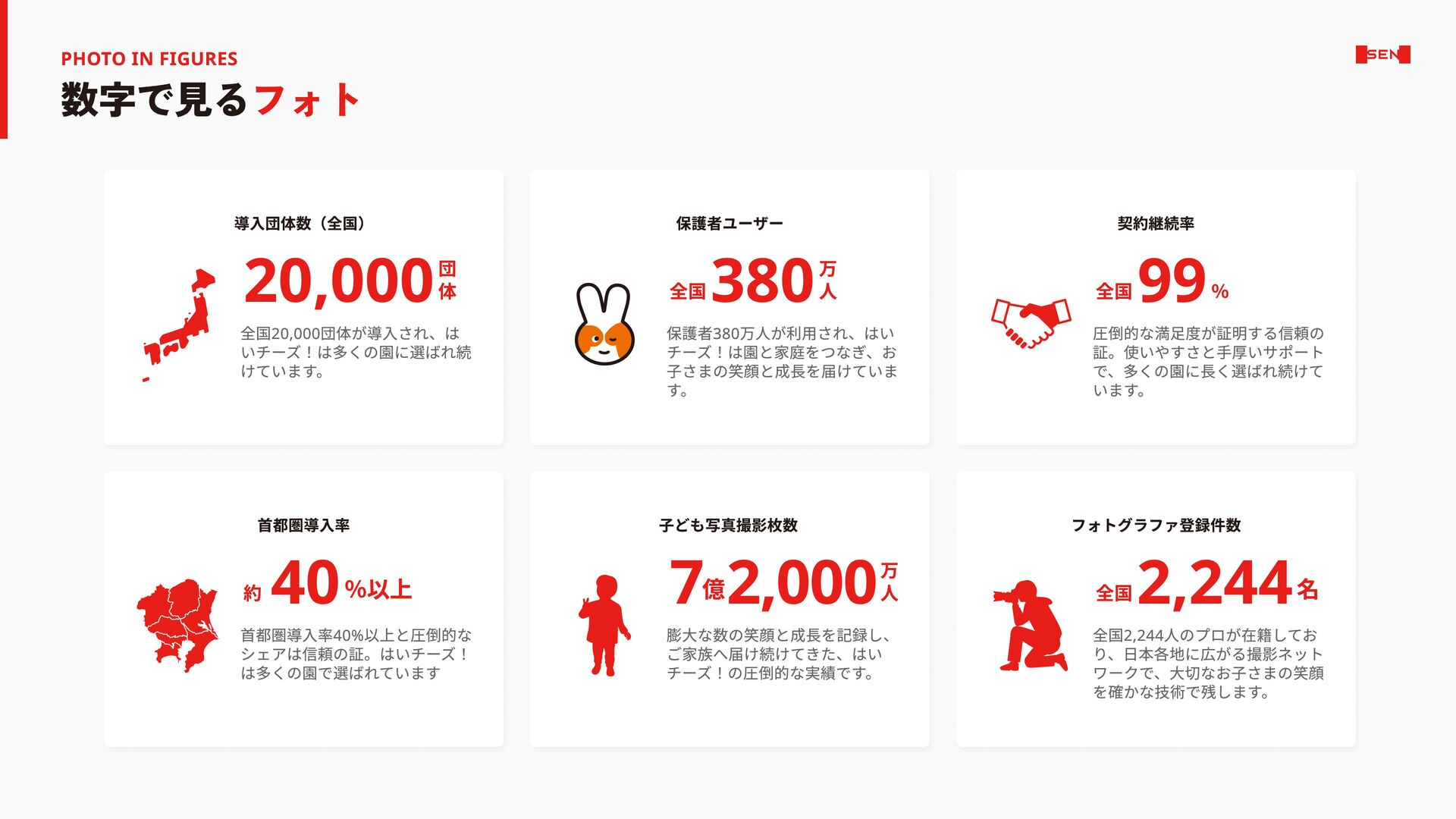 保護者ユーザー 全国 380万 人 保護者380万人が利用され、はい チーズ!は園と家庭をつなぎ、お 子さまの笑顔と成長を届けていま す。 契約継続率 全国 99% 圧倒的な満足度が証明する信頼の 証。使いやすさと手厚いサポート で、多くの園に長く選ばれ続けて います。 首都圏導入率 約 40%以上 首都圏導入率40%以上と圧倒的な シェアは信頼の証。はいチーズ! は多くの園で選ばれています 子ども写真撮影枚数 7億 2,000万 人 膨大な 数の笑顔と成長を 記録し、 ご家 族へ届け続けて きた、はい チーズ!の圧倒的な 実績です。 フォトグラファ登録件数 全国 2,244名 全国2,244人の プロが 在籍してお り、 日本各地に 広がる 撮影ネット ワー クで、 大切なお子さまの笑顔 を 確かな 技術で 残します。