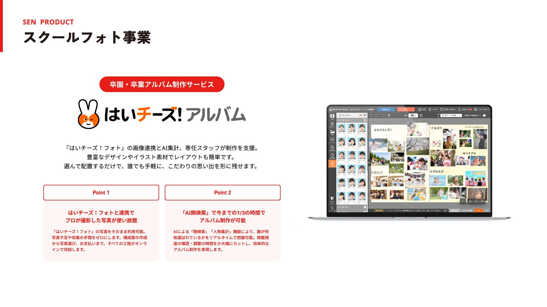 から写真選び、お支払いまで、すべての工程がオンラ インで完結します。 はいチーズ!フォトと連携で プロが撮影した写真が使い放題 「はいチーズ!フォト」の写真をそのまま利用可能。 写真不足や収集の手間をゼロにします。構成案の作成 から写真選び、お支払いまで、すべての工程がオンラ インで完結します。 Point 2 「AI顔検索」で今までの1/3の時間で アルバム制作が可能 AIによる「顔検索」「人物集計」機能により、誰が何 枚選ばれているかをリアルタイムで把握可能。掲載頻 度の確認・調整の時間をか大幅にカットし、効率的な アルバム制作を実現します。 「AI顔検索」で今までの1/3の時間で アルバム制作が可能 AIによる「顔検索」「人物集計」機能により、誰が何 枚選ばれているかをリアルタイムで把握可能。掲載頻 度の確認・調整の時間をか大幅にカットし、効率的な アルバム制作を実現します。 SEN PRODUCT スクールフォト事業