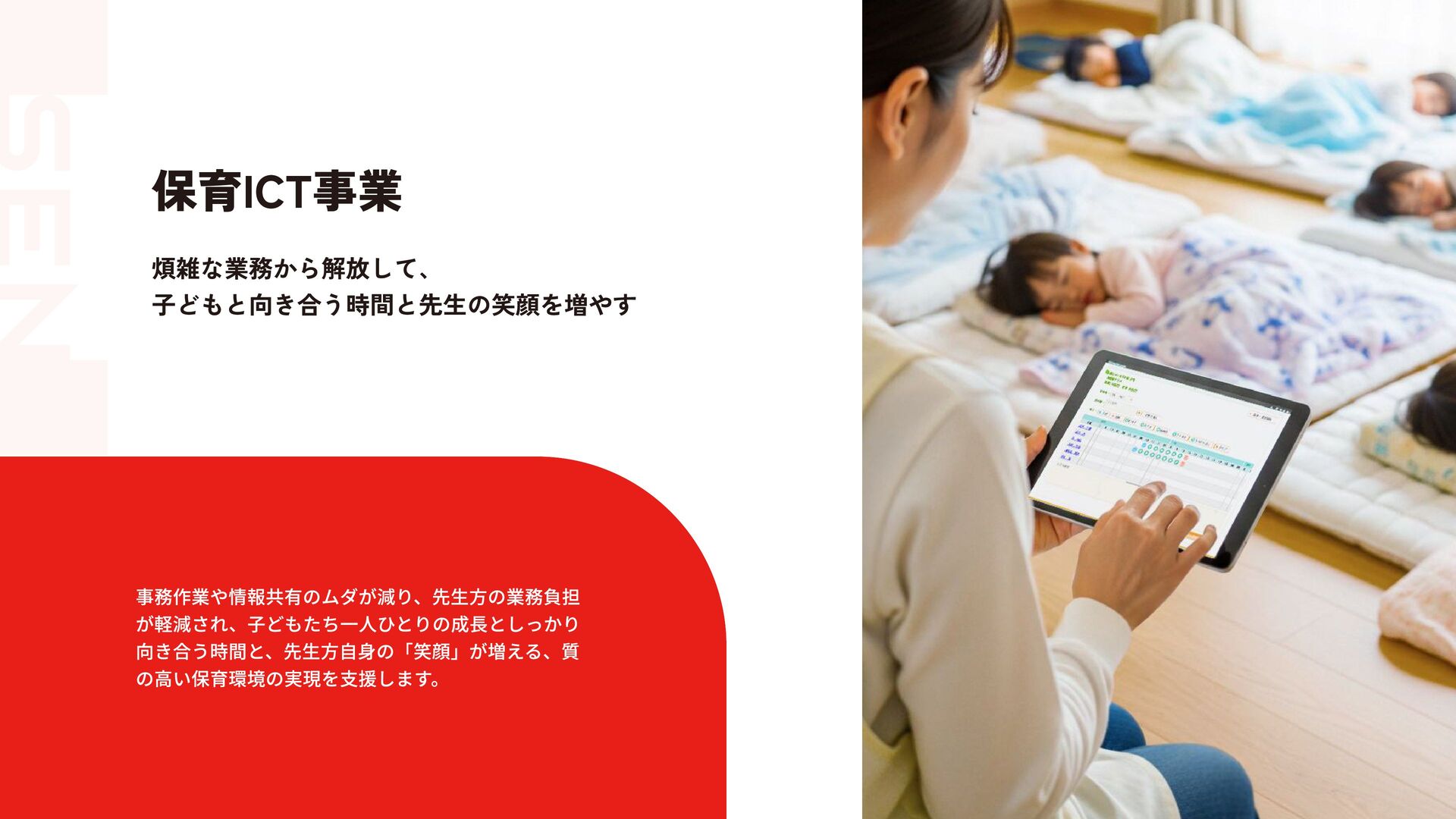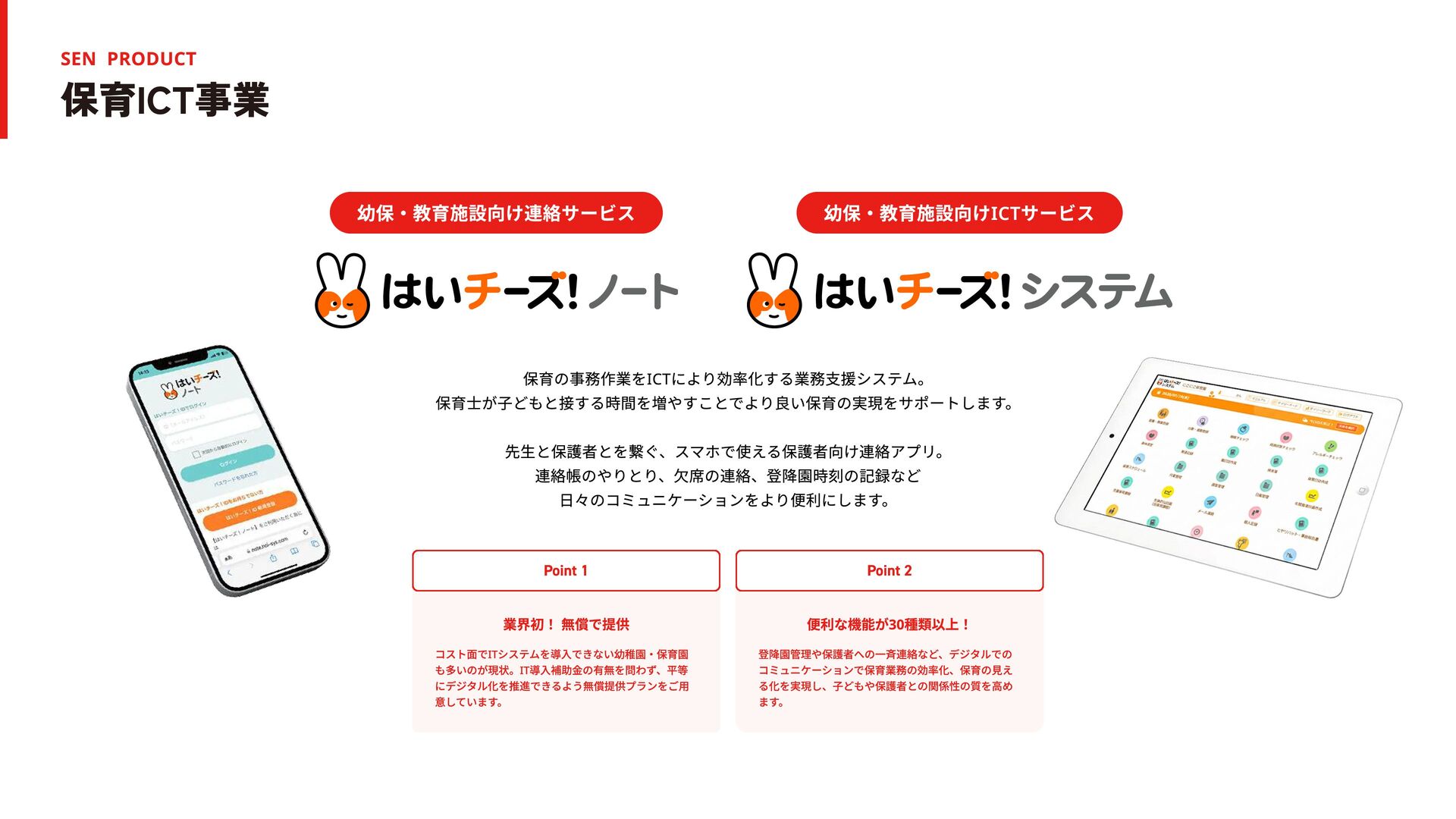 無償で提供 コスト面でITシステムを導入できない幼稚園・保育園 も多いのが現状。IT導入補助金の有無を問わず、平等 にデジタル化を推進できるよう無償提供プランをご用 意しています。 業界初! 無償で提供 コスト面でITシステムを導入できない幼稚園・保育園 も多いのが現状。IT導入補助金の有無を問わず、平等 にデジタル化を推進できるよう無償提供プランをご用 意しています。 Point 2 便利な機能が30種類以上! 登降園管理や保護者への一斉連絡など、デジタルでの コミュニケーションで保育業務の効率化、保育の見え る化を実現し、子どもや保護者との関係性の質を高め ます。 便利な機能が30種類以上! 登降園管理や保護者への一斉連絡など、デジタルでの コミュニケーションで保育業務の効率化、保育の見え る化を実現し、子どもや保護者との関係性の質を高め ます。 SEN PRODUCT 保育ICT事業