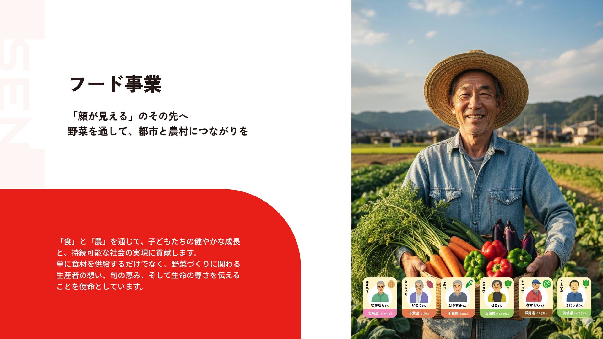 「食」と「農」を通じて、子どもたちの健やかな成長 と、持続可能な社会の実現に貢献します。 単に食材を供給するだけでなく、野菜づくりに関わる 生産者の想い、旬の恵み、そして生命の尊さを伝える ことを使命としています。 フード事業 「顔が見える」のその先へ 野菜を通して、都市と農村につながりを