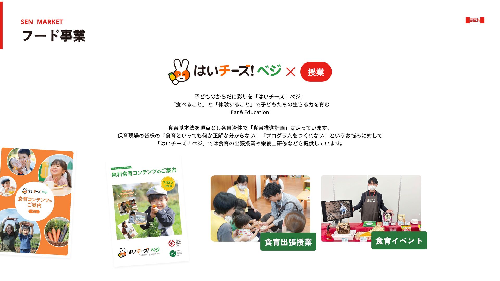 SEN MARKET フード事業 授業 子どものからだに彩りを「はいチーズ!べジ」 「食べること」と「体験すること」で子どもたちの生きる力を育む Eat&Education 食育基本法を頂点とし各自治体で「食育推進計画」は走っています。 保育現場の皆様の「食育といっても何か正解か分からない」「プログラムをつくれない」というお悩みに対して 「はいチーズ!べジ」では食育の出張授業や栄養士研修などを提供しています。