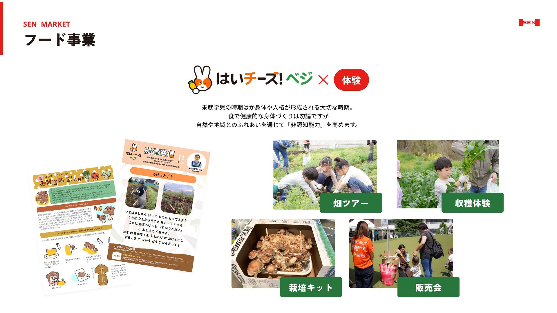 SEN MARKET フード事業 体験 未就学児の時期はか身体や人格が形成される大切な時期。 食で健康的な身体づくりは勿論ですが 自然や地域とのふれあいを通じて「非認知能力」を高めます。 畑ツアー 収穫体験 栽培キット