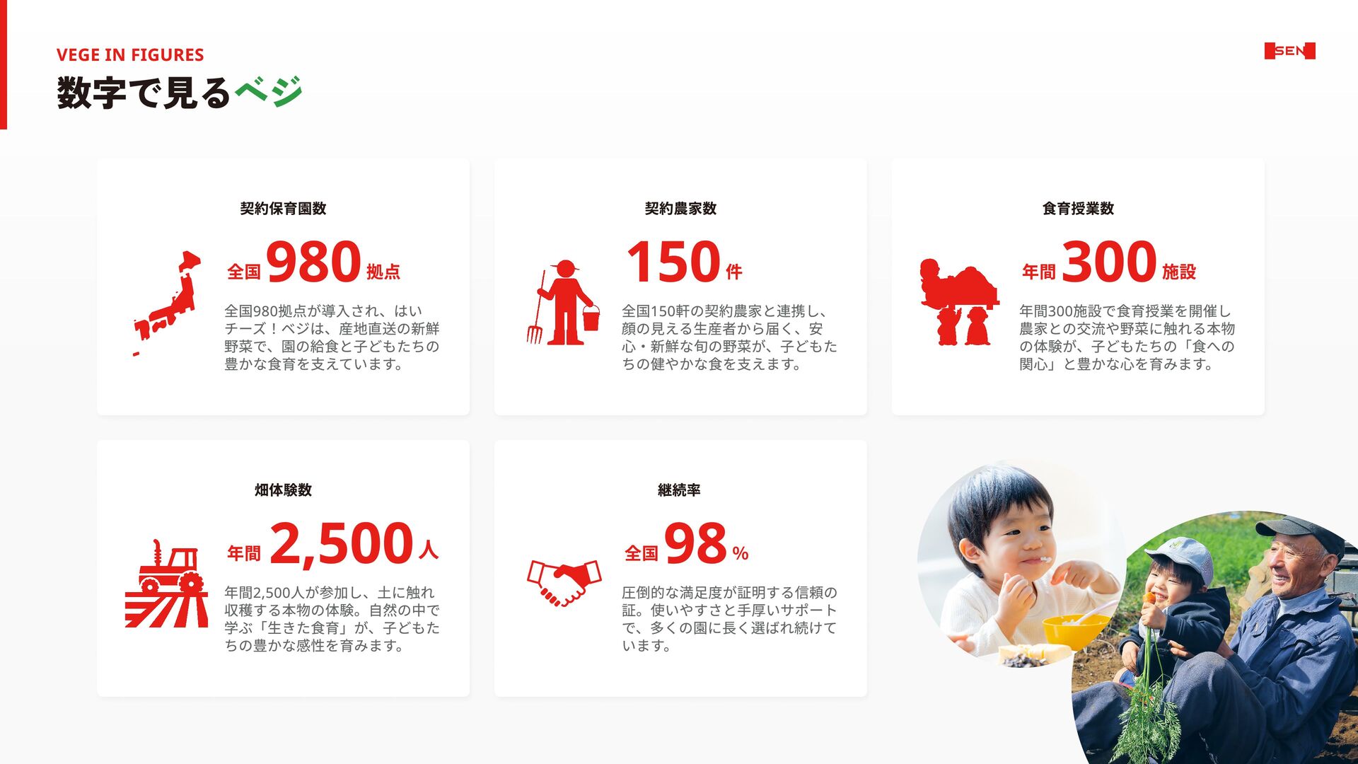 Vege IN Figures 数字で見るベジ 契約保育園数 全国 980拠点 全国980拠点が導入され、はい チーズ!ベジは、産地直送の新鮮 野菜で、園の給食と子どもたちの