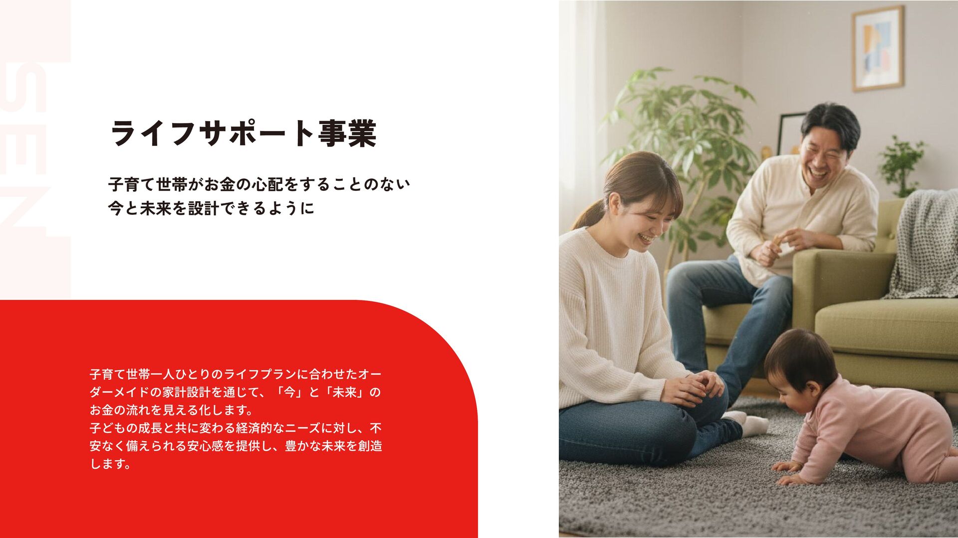 子育て世帯一人ひとりのライフプランに合わせたオー ダーメイドの家計設計を通じて、「今」と「未来」の お金の流れを見える化します。 子どもの成長と共に変わる経済的なニーズに対し、不 安なく備えられる安心感を提供し、豊かな未来を創造 します。 ライフサポート事業 子育て世帯がお金の心配をすることのない 今と未来を設計できるように