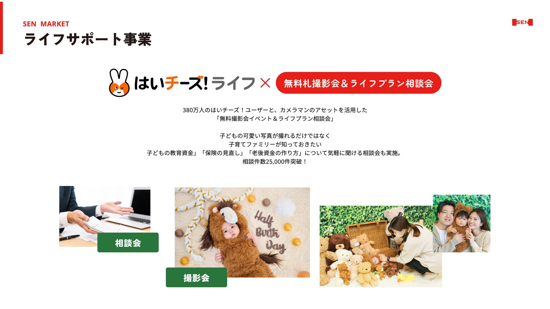 SEN MARKET ライフサポート事業 無料札撮影会&ライフプラン相談会 380万人のはいチーズ!ユーザーと、カメラマンのアセットを活用した 「無料撮影会イベント&ライフプラン相談会」 子どもの可愛い写真が撮れるだけではなく 子育てファミリーが知っておきたい 子どもの教育資金」「保険の見直し」「老後資金の作り方」について気軽に聞ける相談会も実施。 相談件数25,000件突破!