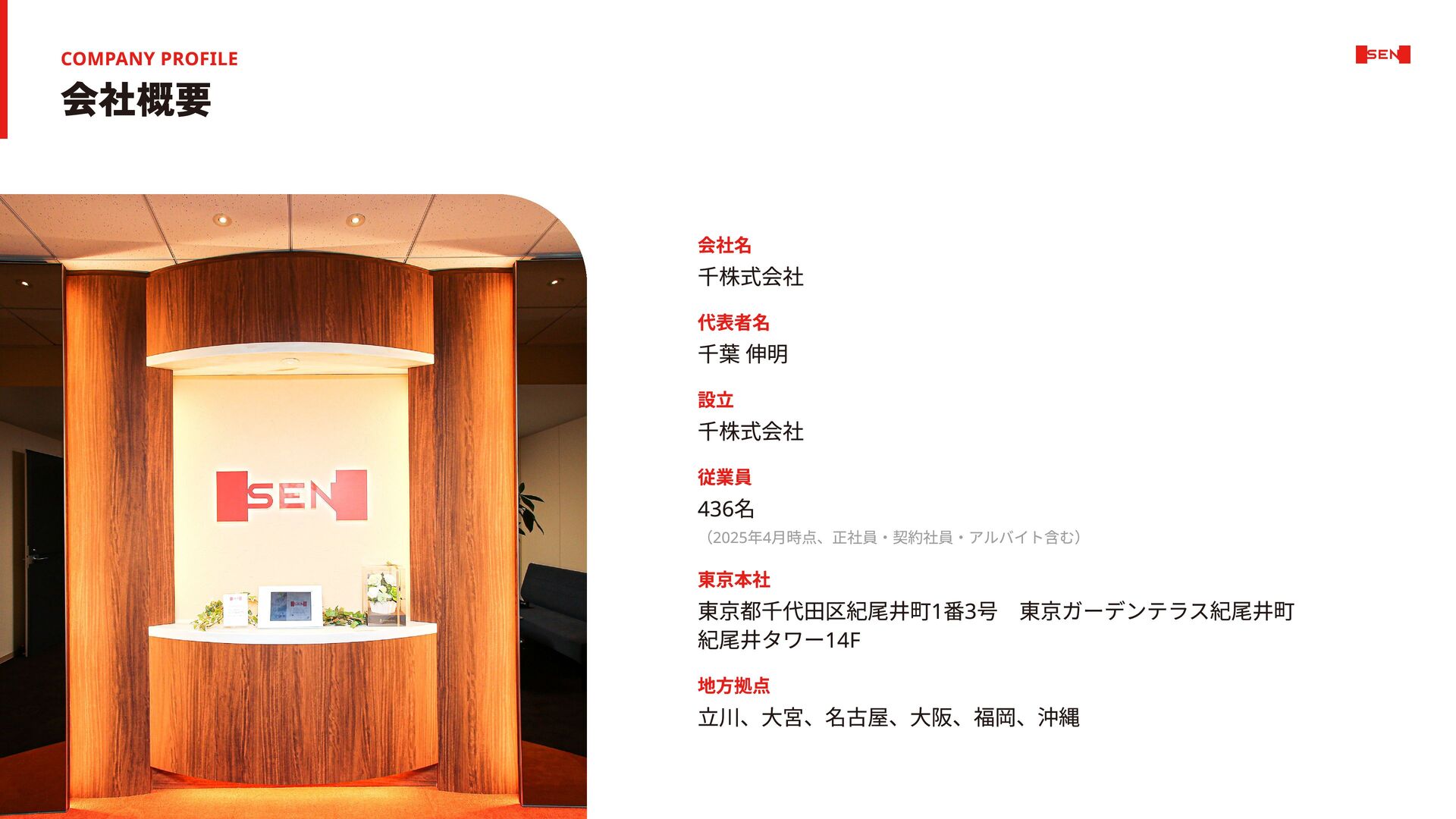 会社名 千株式会社 代表者名 千葉 伸明 設立 千株式会社 従業員 436名 (2025年4月時点、正社員・契約社員・アルバイト含む)