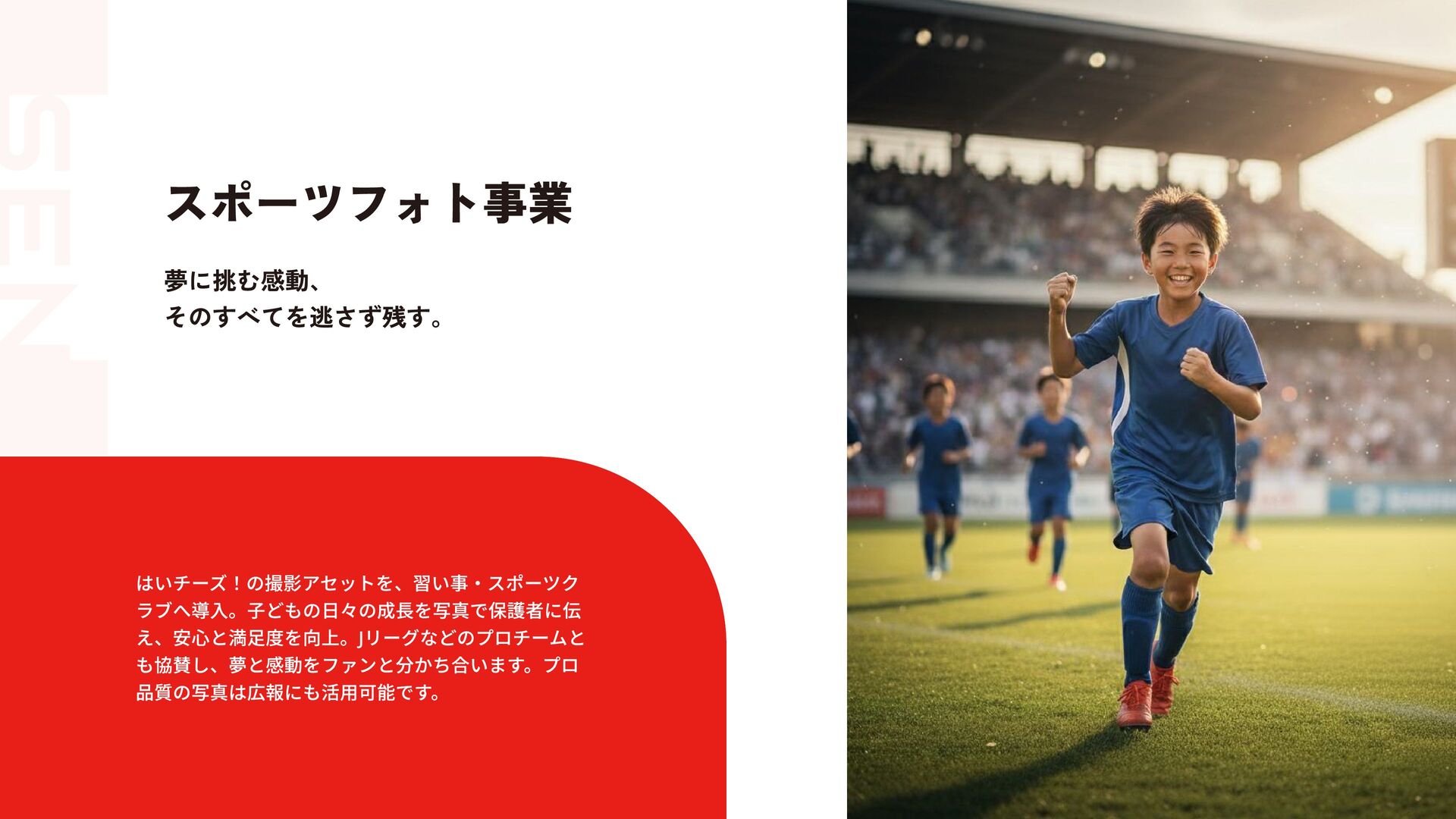 はいチーズ!の撮影アセットを、習い事・スポーツク ラブへ導入。子どもの日々の成長を写真で保護者に伝 え、安心と満足度を向上。Jリーグなどのプロチームと も協賛し、夢と感動をファンと分かち合います。プロ 品質の写真は広報にも活用可能です。 スポーツフォト事業 夢に挑む感動、 そのすべてを逃さず残す。
