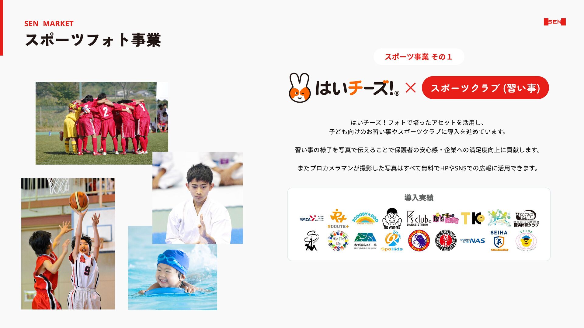 活用し、 子ども 向けの お習い 事や スポーツクラブに 導入を 進めています。 習い事の 様子を 写真で 伝える ことで 保護者の 安心感・企業への 満足度向上に 貢献します。 また プロカメラマンが 撮影した 写真は すべて 無料で HPや SNSでの 広報に 活用できます。 導入実績 SEN MARKET スポーツフォト事業