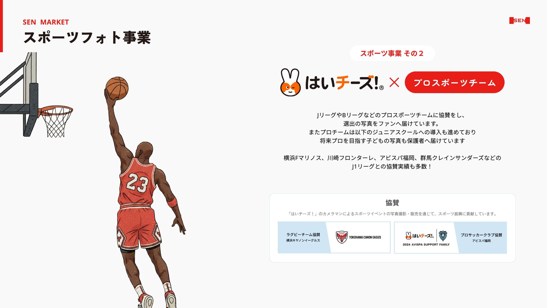 SEN MARKET スポーツフォト事業 スポーツ事業 その2 プロスポーツチーム JリーグやBリーグなどのプロスポーツチームに協賛をし、 選出の写真をファンへ届けています。 またプロチームは以下のジュニアスクールへの導入も進めており 将来プロを目指す子どもの写真も保護者へ届けています