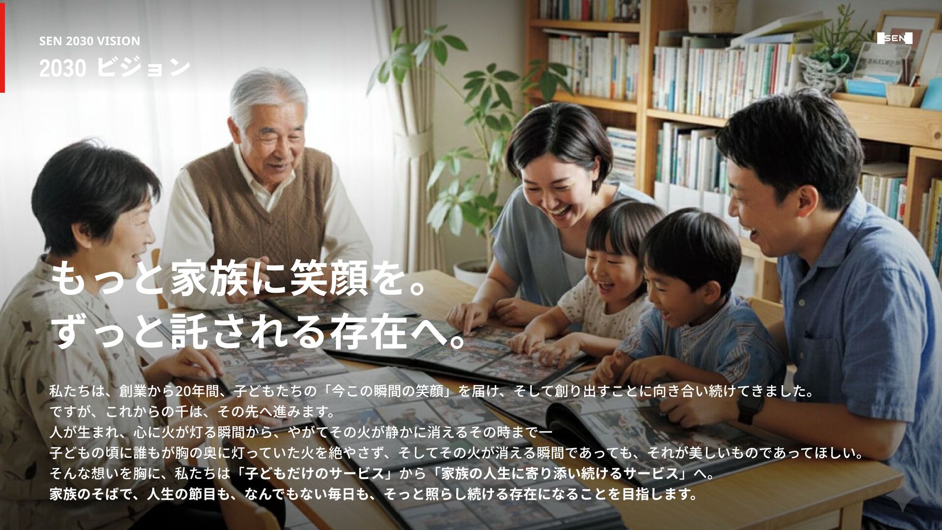SEN 2030 VISION 2030 ビジョン もっと家族に笑顔を。 ずっと託される存在へ。 私たちは、創業から20年間、子どもたちの「今この瞬間の笑顔」を届け、そして創り出すことに向き合い続けてきました。 ですが、これからの千は、その先へ進みます。 人が生まれ、心に火が灯る瞬間から、やがてその火が静かに消えるその時まで一