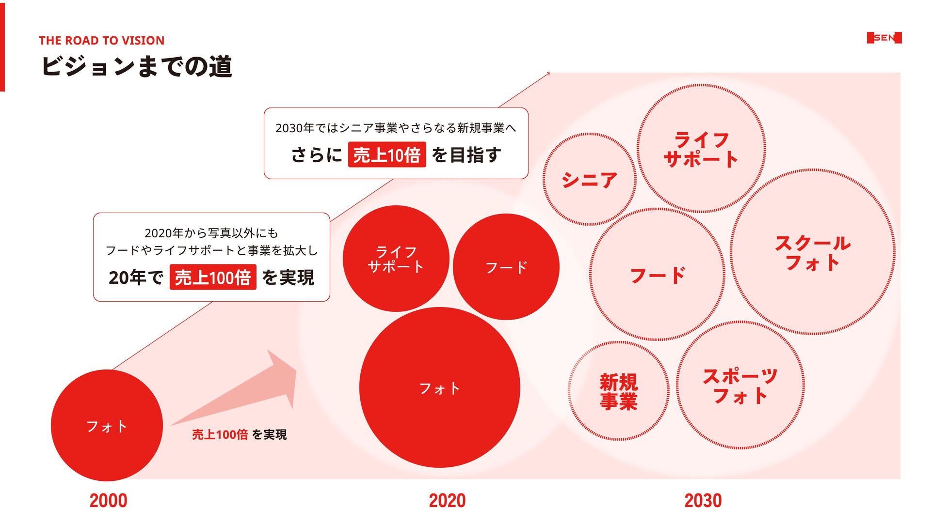 2000 2020 ライフ サポート フード フォト フォト 売上100倍 を実現 The road to vision ビジョンまでの道 2030 さらに を目指す 2030年ではシニア事業やさらなる新規事業へ さらに 売上10倍 を目指す 20年で を実現 2020年から写真以外にも フードやライフサポートと事業を拡大し 20年で 売上100倍 を実現