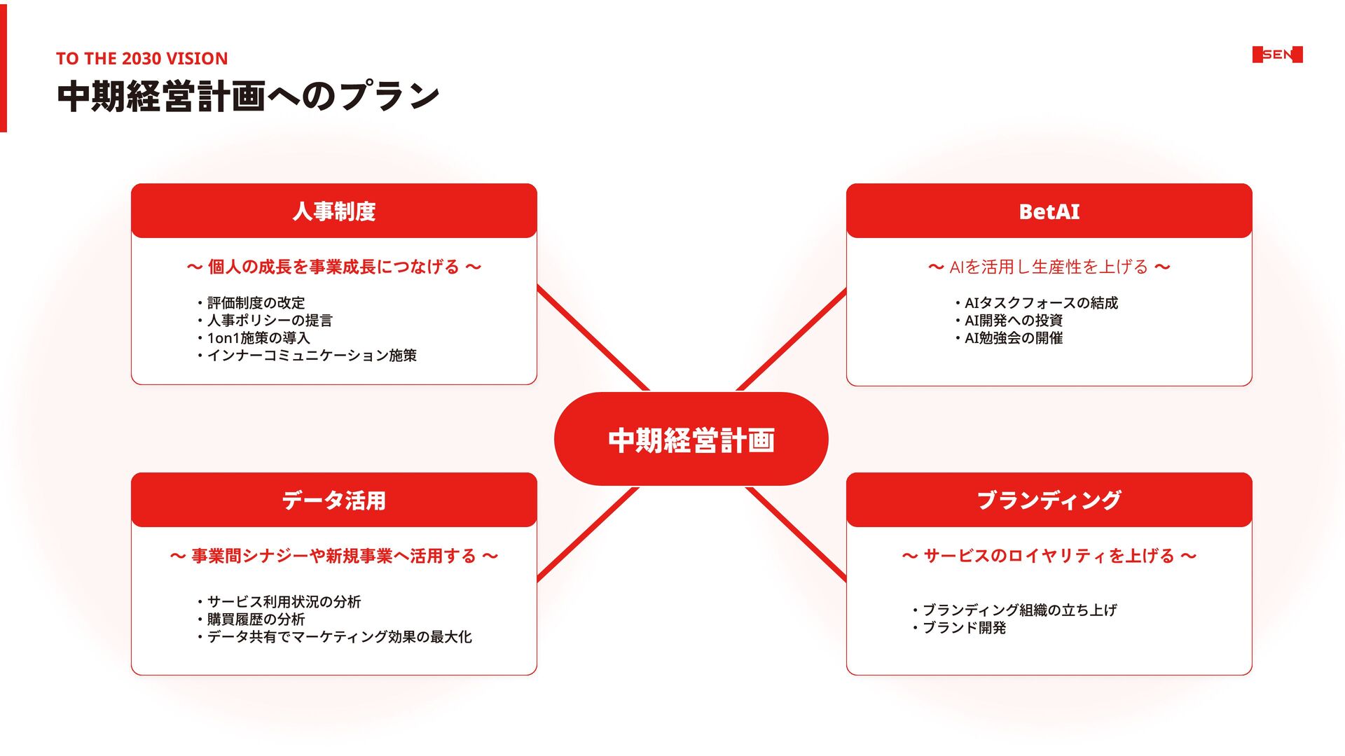 ・評価制度の改定 ・人事ポリシーの提言 ・1on1施策の導入 ・インナーコミュニケーション施策 BetAI ~ AIを活用し生産性を上げる ~ ・AIタスクフォースの結成 ・AI開発への投資 ・AI勉強会の開催 データ活用 ~ 事業間シナジーや新規事業へ活用する ~ ・サービス利用状況の分析 ・購買履歴の分析 ・データ共有でマーケティング効果の最大化 ブランディング ~ サービスのロイヤリティを上げる ~ ・ブランディング組織の立ち上げ ・ブランド開発