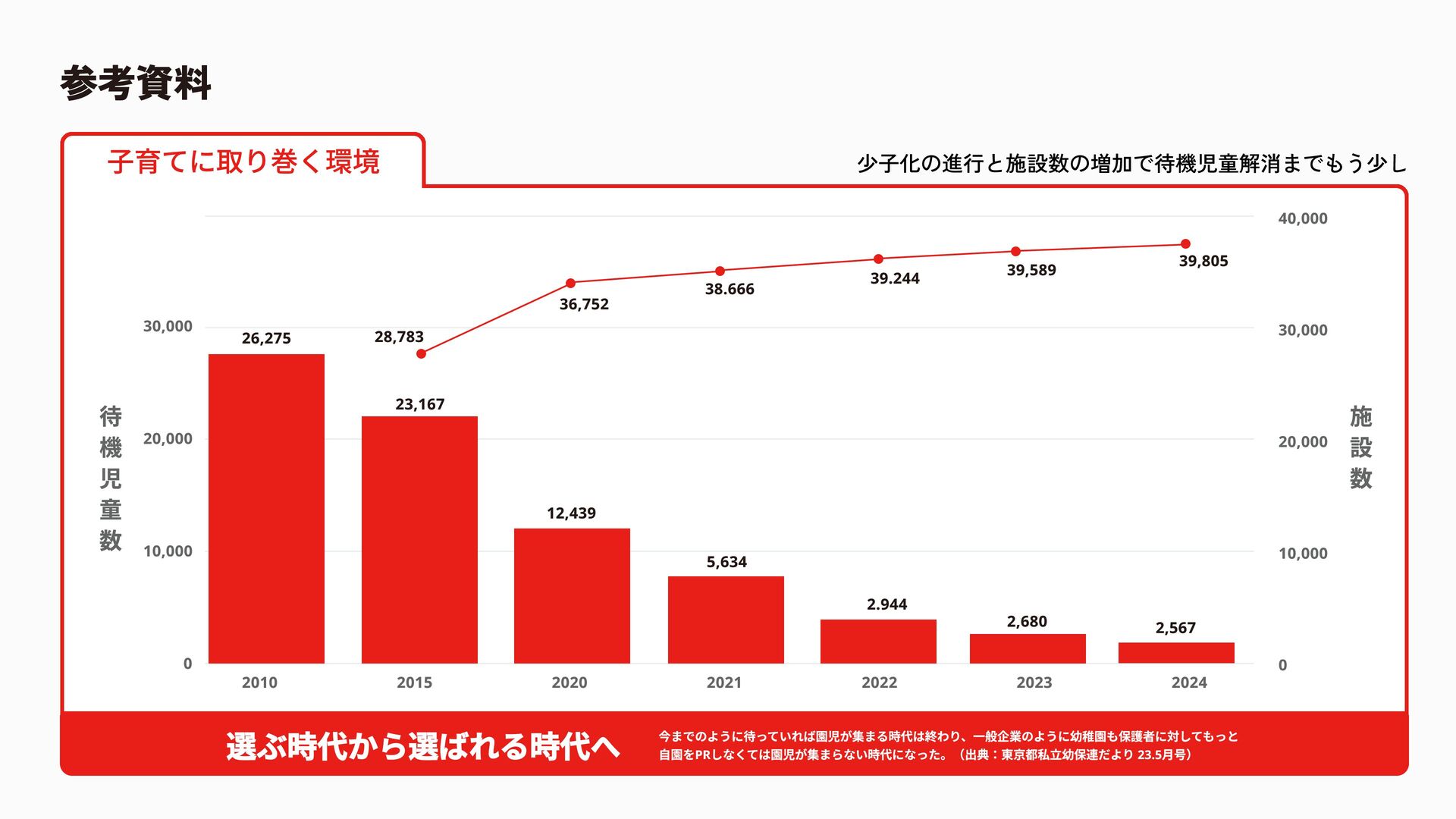 12,439 5,634 2.944 2,680 2,567 2010 2015 2020 2021 2022 2023 2024 30,000 20,000 10,000 0 26,275 23,167 40,000 30,000 20,000 10,000 0 待 機 児 童 数 施 設 数 子育てに取り巻く環境 少子化の進行と施設数の増加で待機児童解消までもう少し 参考資料