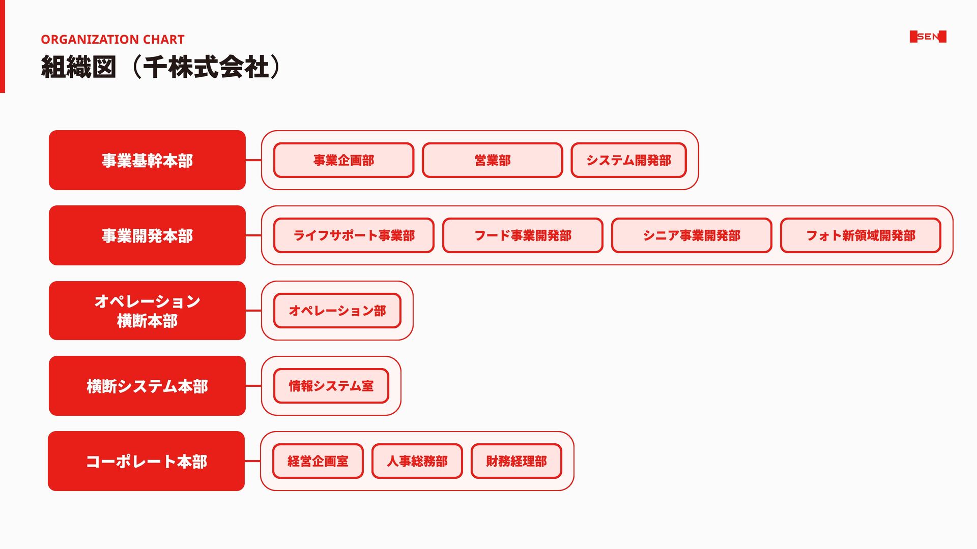 organization chart 組織図(千株式会社) 事業基幹本部 事業企画部 営業部 システム開発部 事業開発本部 ライフサポート事業部 フード事業開発部