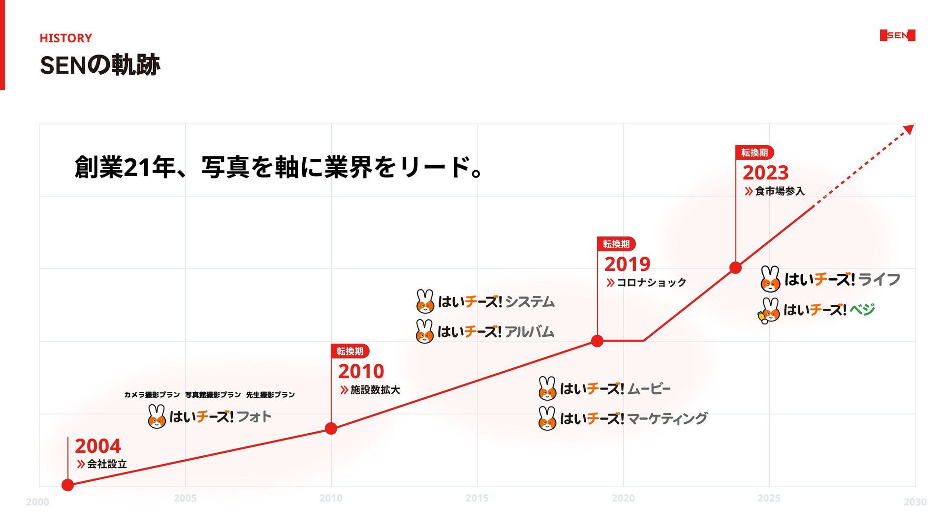 HISTORY SENの軌跡 2000 2005 2010 2015 2020 2025 2030 創業21年、写真を軸に業界をリード。