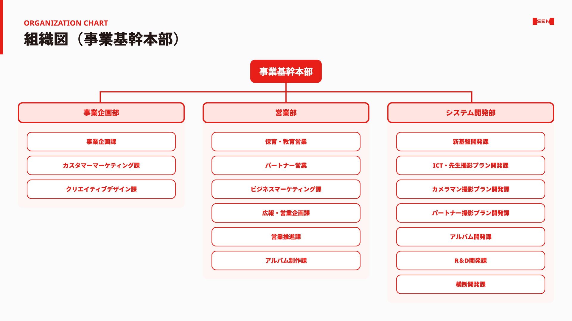 パートナー営業 ビジネスマーケティング課 広報・営業企画課 営業推進課 アルバム制作課 システム開発部 新基盤開発課 ICT・先生撮影プラン開発課 カメラマン撮影プラン開発課 パートナー撮影プラン開発課 アルバム開発課 R&D開発課 横断開発課