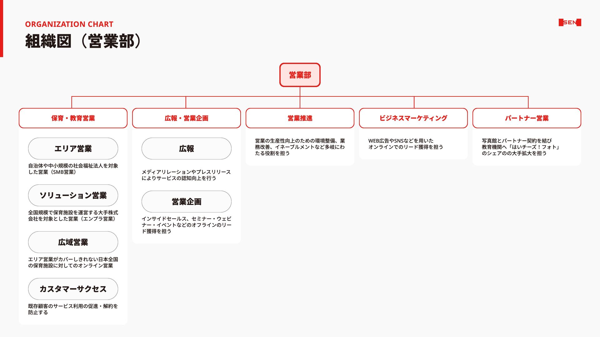 organization chart 組織図(営業部) 営業部 保育・教育営業 エリア営業 自治体や中小規模の社会福祉法人を対象 した営業(SMB営業) ソリューション営業 全国規模で保育施設を運営する大手株式