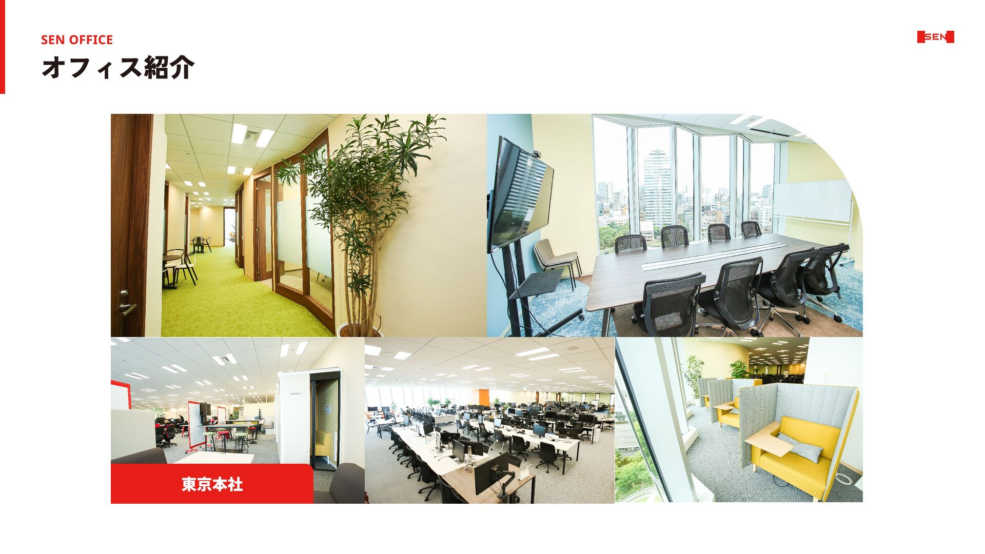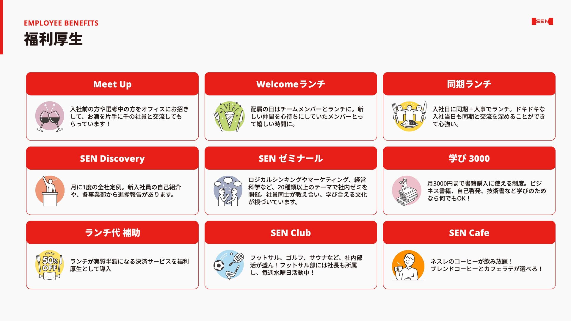 しい仲間を心待ちにしていたメンバーとっ て嬉しい時間に。 同期ランチ 入社日に同期+人事でランチ。ドキドキな 入社当日も同期と交流を深めることができ て心強い。 SEN Discovery 月に1度の全社定例。新入社員の自己紹介 や、各事業部から進捗報告があります。 SEN ゼミナール ロジカルシンキングやマーケティング、経営 科学など、20種類以上のテーマで社内ゼミを 開催。社員同士が教え合い、学び合える文化 が根づいています。 学び 3000 月3000円まで書籍購入に使える制度。ビジ ネス書籍、自己啓発、技術書など学びのため なら何でもOK! ランチ代 補助 ランチが実質半額になる決済サービスを福利 厚生として導入 SEN Club フットサル、ゴルフ、サウナなど、社内部 活が盛ん!フットサル部には社長も所属 し、毎週水曜日活動中! SEN Cafe ネスレのコーヒーが飲み放題! ブレンドコーヒーとカフェラテが選べる!