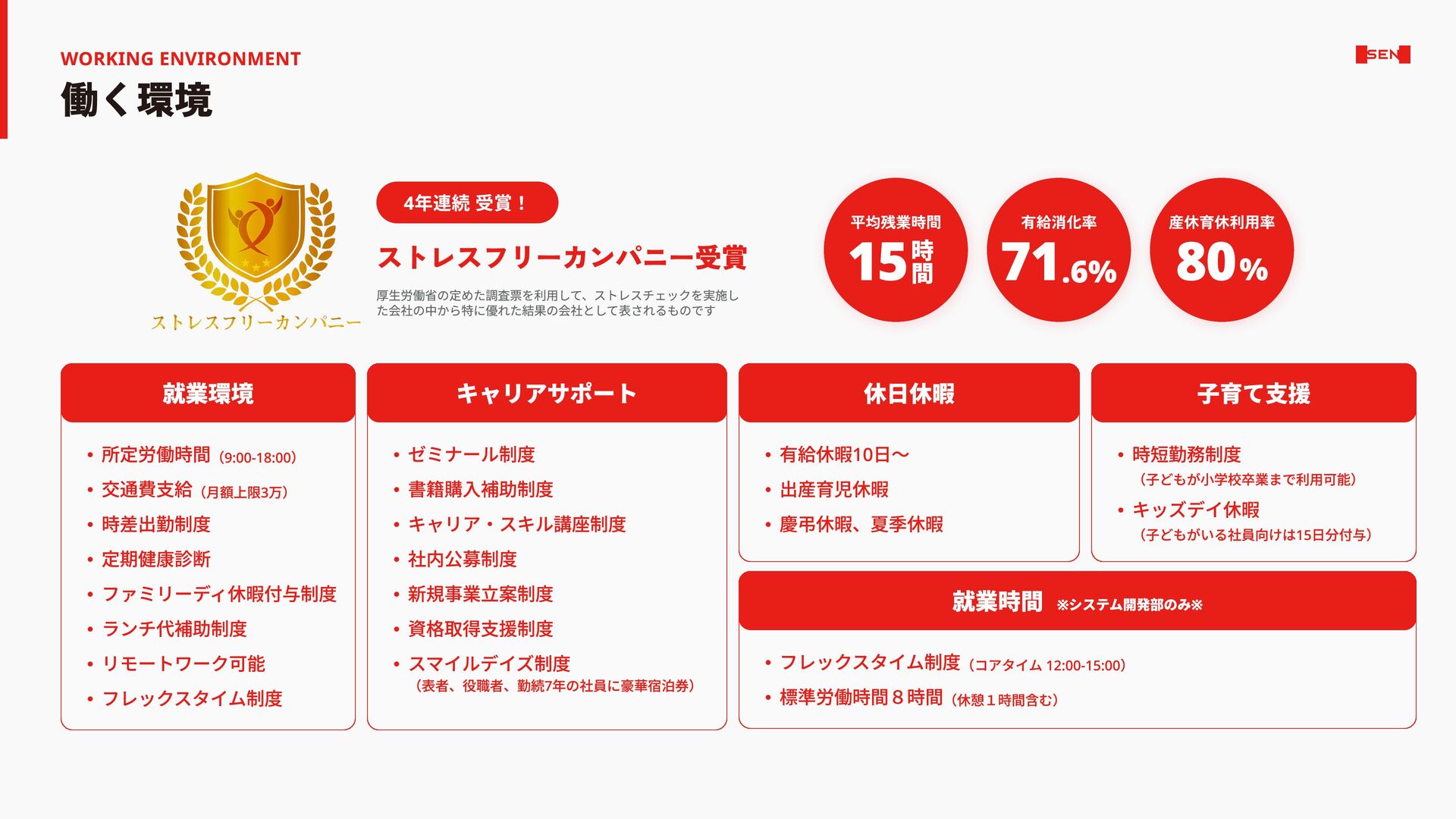・フレックスタイム制度 就業環境 ・所定労働時間(9:00-18:00) ・交通費支給(月額上限3万) ・時差出勤制度 ・定期健康診断 ・ファミリーディ休暇付与制度 ・ランチ代補助制度 ・リモートワーク可能 ・フレックスタイム制度 ・ゼミナール制度 ・書籍購入補助制度 ・キャリア・スキル講座制度 ・社内公募制度 ・新規事業立案制度 ・資格取得支援制度 ・スマイルデイズ制度 (表者、役職者、勤続7年の社員に豪華宿泊券) キャリアサポート ・ゼミナール制度 ・書籍購入補助制度 ・キャリア・スキル講座制度 ・社内公募制度 ・新規事業立案制度 ・資格取得支援制度 ・スマイルデイズ制度 (表者、役職者、勤続7年の社員に豪華宿泊券) 4年連続 受賞! ストレスフリーカンパニー受賞 厚生労働省の定めた調査票を利用して、ストレスチェックを実施し た会社の中から特に優れた結果の会社として表されるものです 平均残業時間 15時 間 有給消化率 71.6% 産休育休利用率 80% ・時 短勤 務制度 ( 子どもが小学校卒業 まで利用可能) ・キッズデイ休暇 ( 子どもがいる社員 向けは1 5日分付与) 子育て支援 ・時 短勤 務制度 ( 子どもが小学校卒業 まで利用可能) ・キッズデイ休暇 ( 子どもがいる社員 向けは1 5日分付与) ・有給休暇10 日〜 ・出 産育児休暇 ・慶弔休暇、 夏季休暇 休日休暇 ・有給休暇10 日〜 ・出 産育児休暇 ・慶弔休暇、 夏季休暇 ・フレックスタイム制度( コアタイム 1 2:00-1 5:00) ・標準労働時間 8時間(休 憩1時間 含む) 就業 時間 ※システム開発部のみ※ ・フレックスタイム制度( コアタイム 1 2:00-1 5:00) ・標準労働時間 8時間(休 憩1時間 含む)