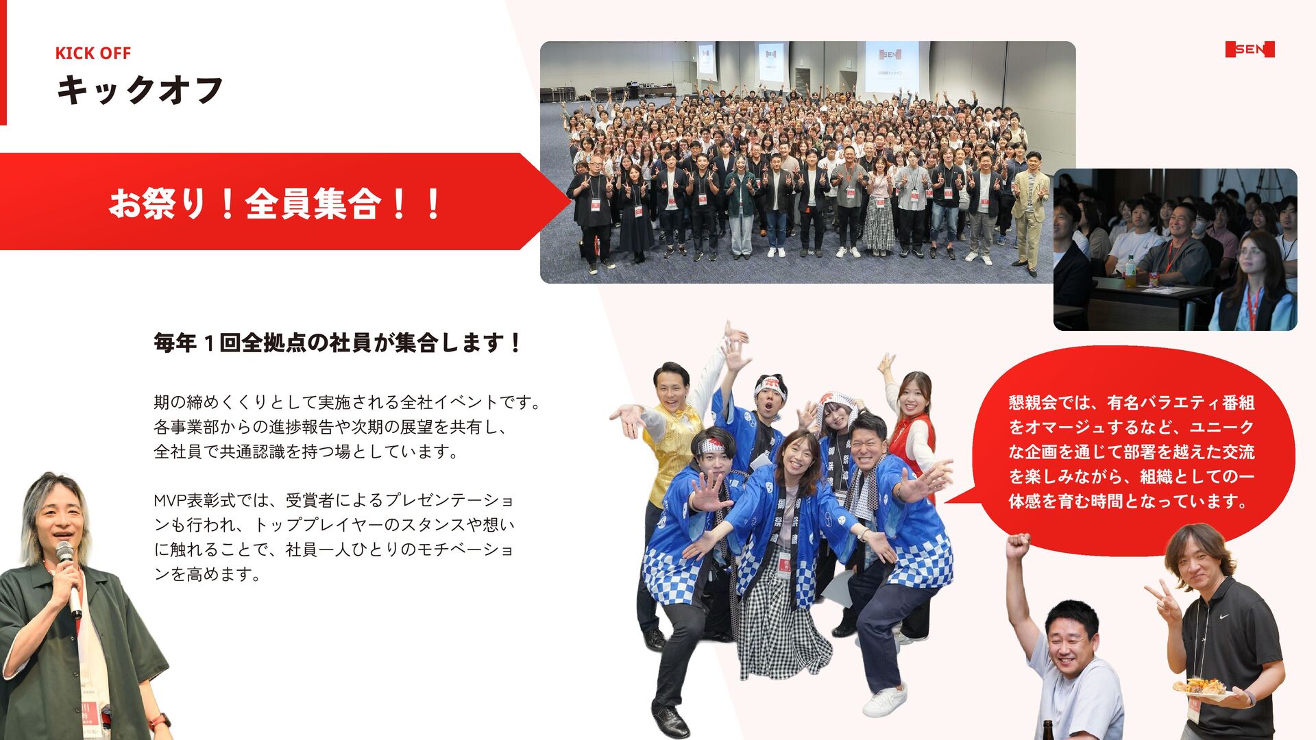 KICK OFF キックオフ 毎年1回全拠点の社員が集合します! 期の締めくくりとして実施される全社イベントです。 各事業部からの進捗報告や次期の展望を共有し、 全社員で共通認識を持つ場としています。 MVP表彰式では、受賞者によるプレゼンテーショ ンも行われ、トッププレイヤーのスタンスや想い に触れることで、社員一人ひとりのモチベーショ