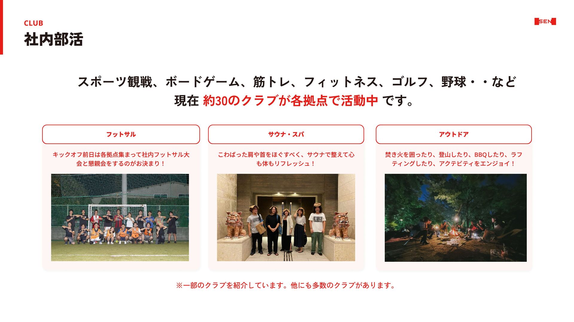 club 社内部活 フットサル キックオフ前日は各拠点集まって社内フットサル大 会と懇親会をするのがお決まり! サウナ・スパ こわばった肩や首をほぐすべく、サウナで整えて心 も体もリフレッシュ! アウトドア 焚き火を囲ったり、登山したり、BBQしたり、ラフ