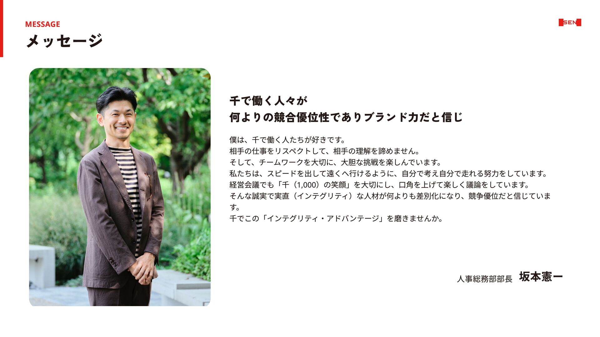 MESSAGE メッセージ 千で働く人々が 何よりの競合優位性でありブランド力だと信じ 僕は、千で働く人たちが好きです。 相手の仕事をリスペクトして、相手の理解を諦めません。 そして、チームワークを大切に、大胆な挑戦を楽しんでいます。 私たちは、スピードを出して遠くへ行けるように、自分で考え自分で走れる努力をしています。 経営会議でも「千(1,000)の笑顔」を大切にし、口角を上げて楽しく議論をしています。 そんな誠実で実直(インテグリティ)な人材が何よりも差別化になり、競争優位だと信じていま