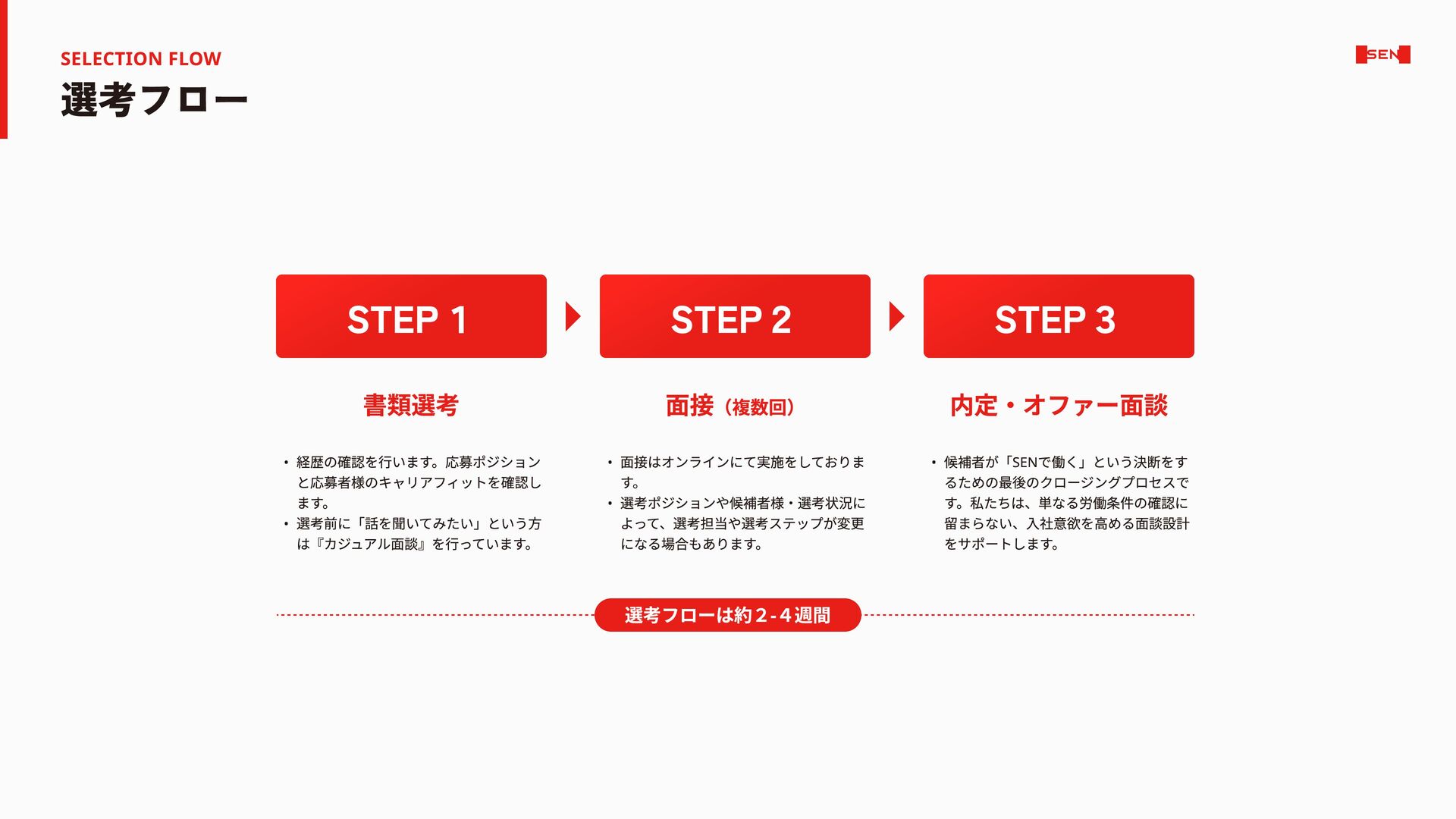 書類選考 STEP2 面接はオンラインにて実施をしておりま す。 選考ポジションや候補者様・選考状況に よって、選考担当や選考ステップが変更 になる場合もあります。 面接(複数回) STEP3 候補者が「SENで働く」という決断をす るための最後のクロージングプロセスで す。私たちは、単なる労働条件の確認に 留まらない、入社意欲を高める面談設計 をサポートします。 内定・オファー面談