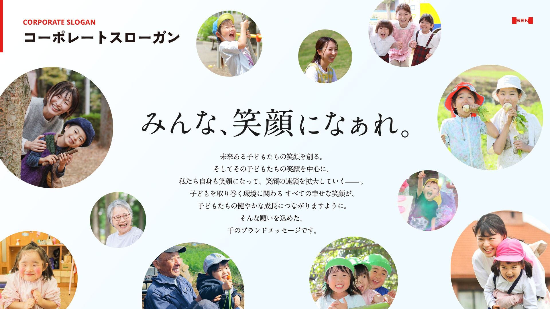 CORPOrate slogan コーポレートスローガン 未来ある子どもたちの笑顔を創る。 そしてその子どもたちの笑顔を中心に、 私たち自身も笑顔になって、笑顔の連鎖を拡大していく—— 。 子どもを取り巻く環境に関わる すべての幸せな笑顔が、 子どもたちの健やかな成長につながりますように。