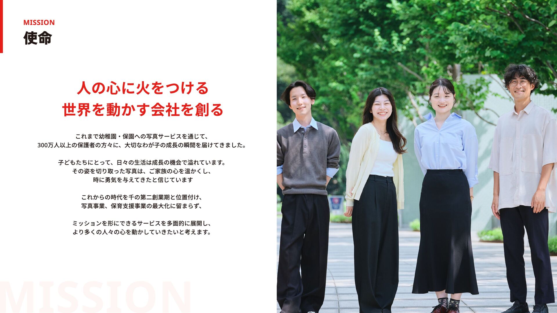 MISSION 使命 人の心に火をつける 世界を動かす会社を創る これまで幼稚園・保園への写真サービスを通じて、 300万人以上の保護者の方々に、大切なわが子の成長の瞬間を届けてきました。 子どもたちにとって、日々の生活は成長の機会で溢れています。 その姿を切り取った写真は、ご家族の心を温かくし、 時に勇気を与えてきたと信じています これからの時代を千の第二創業期と位置付け、