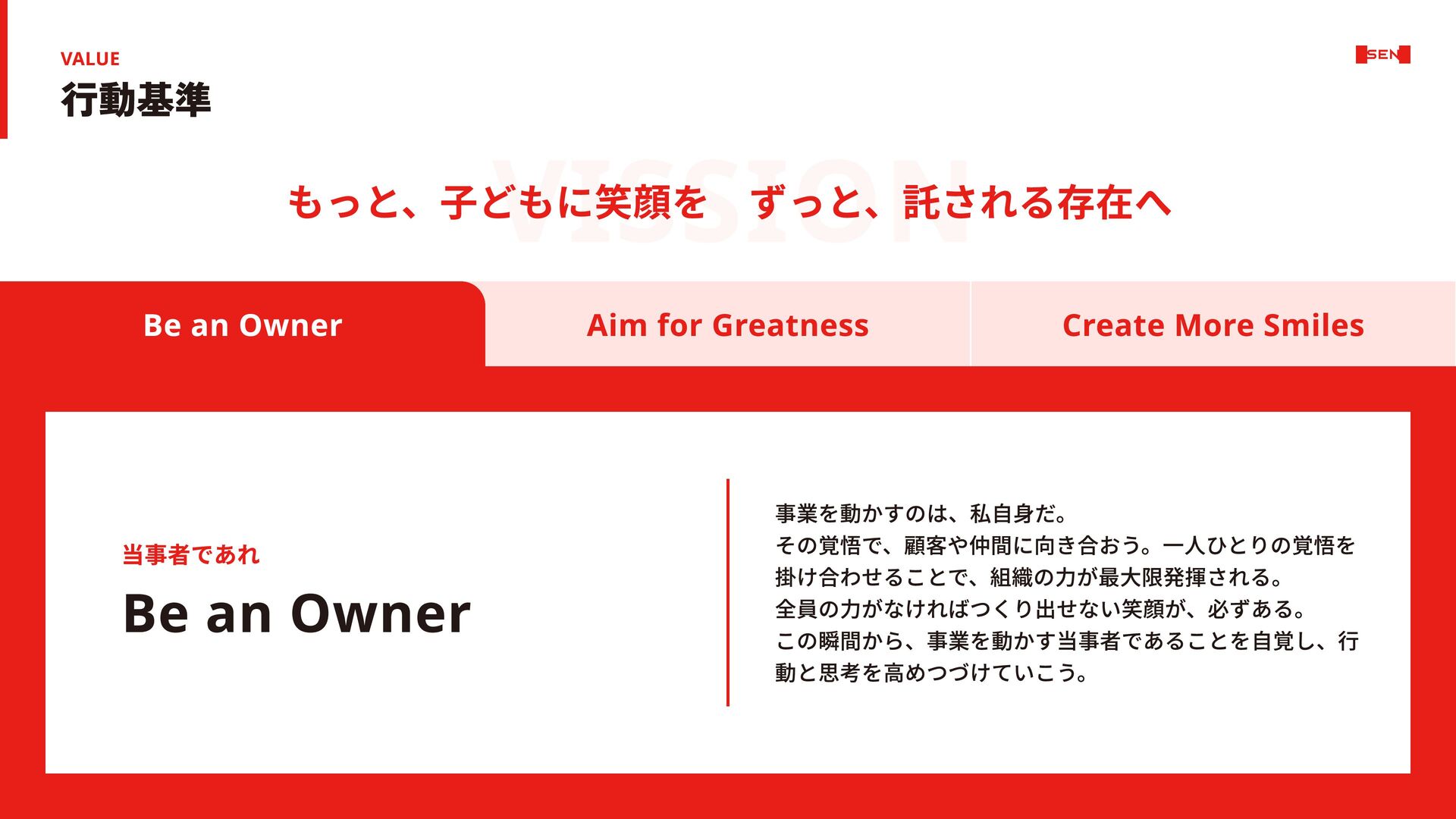 Be an Owner Aim for Greatness Create More Smiles 多くの笑顔をつくる選択を