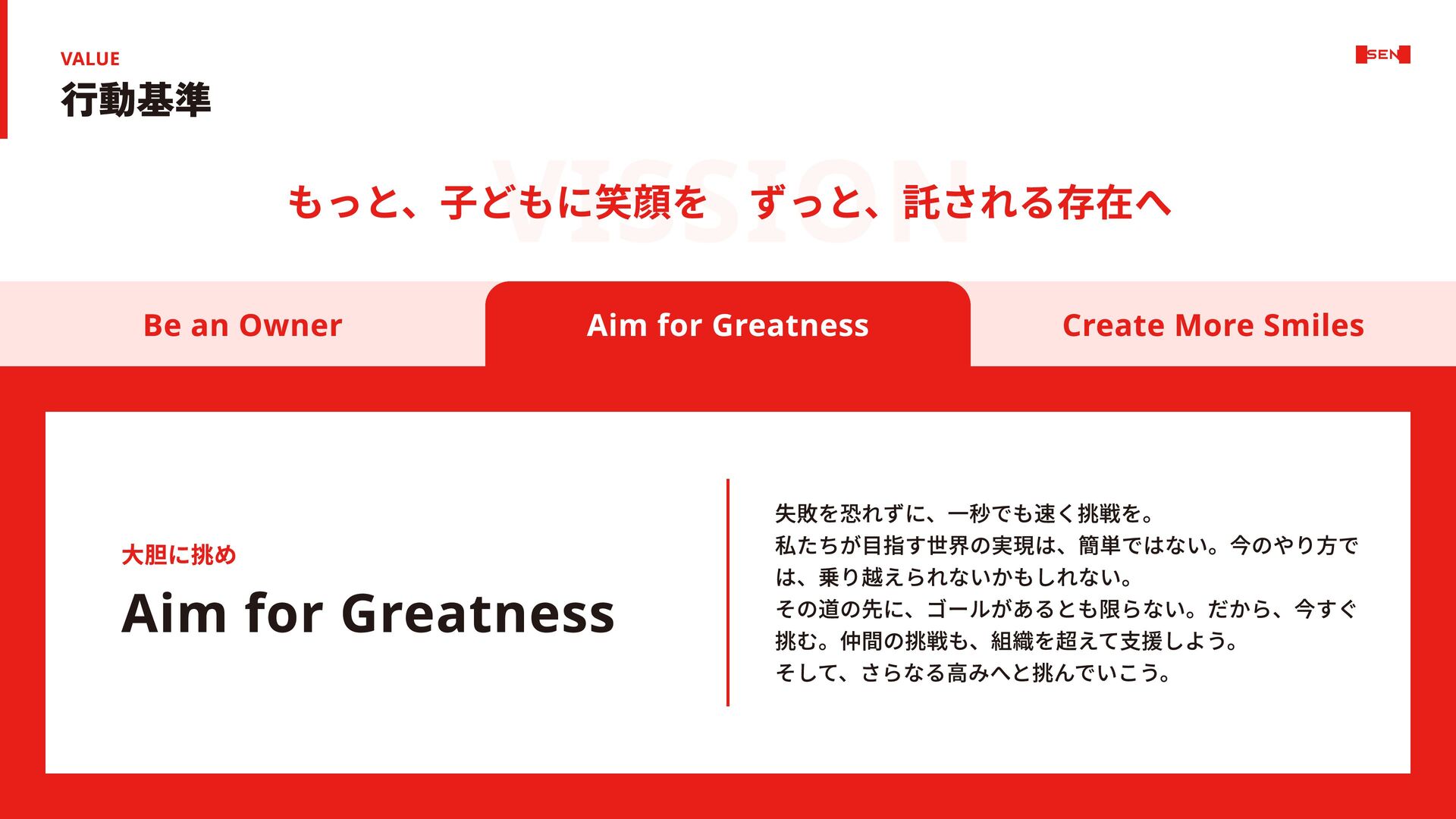 Aim for Greatness 失敗を恐れずに、一秒でも速く挑戦を。 私たちが目指す世界の実現は、簡単ではない。今のやり方で は、乗り越えられないかもしれない。 その道の先に、ゴールがあるとも限らない。だから、今すぐ 挑む。仲間の挑戦も、組織を超えて支援しよう。 そして、さらなる高みへと挑んでいこう。 VALUE 行動基準 もっと、子どもに笑顔を ずっと、託される存在へ