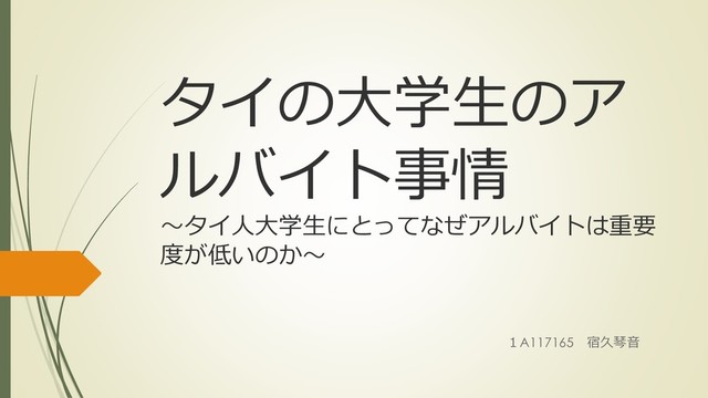 タイの大学生のア ルバイト事情 ~タイ人大学生にとってなぜアルバイトは重要 度が低いのか~ 1A117165 宿久琴音