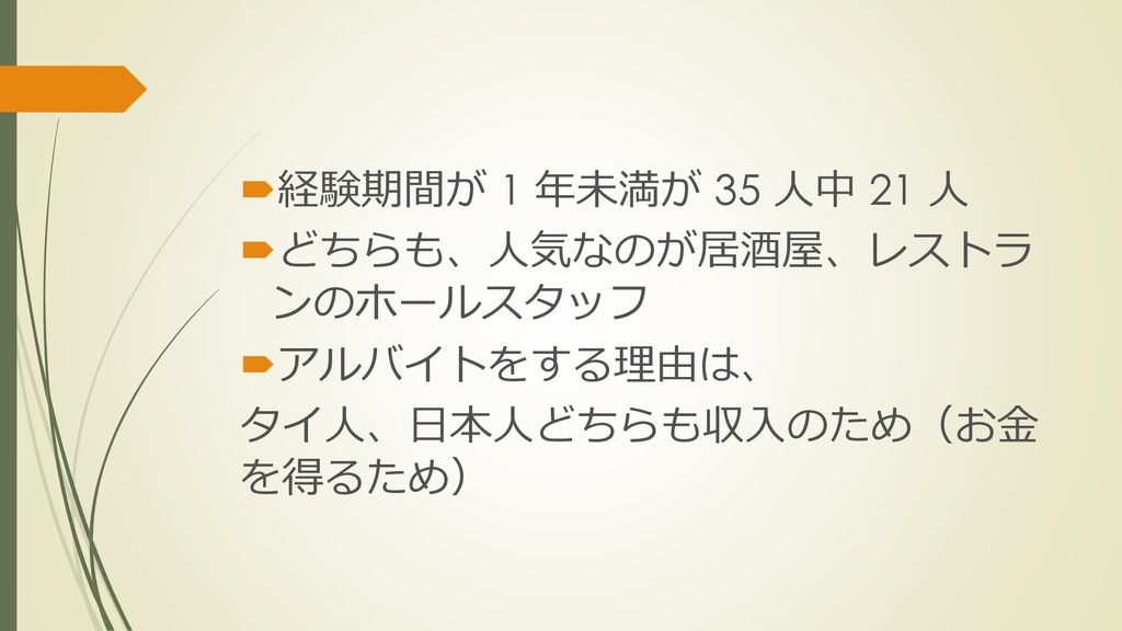 結果 日本人と比較するとタイ人大学 生にとってアルバイトは重要度 が低く、(大学の講義が最優先、 卒業後安定した収入を得る)+ αなもの
