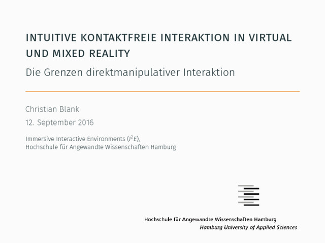 priori gesture recognition. In Proceedings of the SIGCHI Conference on Human Factors in Computing Systems, pages 879–882. ACM, 2010. Otmar Hilliges, David Kim, Shahram Izadi, Malte Weiss, and Andrew Wilson. Holodesk: direct 3d interactions with a situated see-through display. In Proceedings of the 2012 ACM annual conference on Human Factors in Computing Systems, pages 2421–2430. ACM, 2012. Per Ola Kristensson, Thomas Nicholson, and Aaron Quigley. Continuous recognition of one-handed and two-handed gestures using 3d full-body motion tracking sensors. In Proceedings of the 2012 ACM International Conference on Intelligent User Interfaces, IUI ’12, pages 89–92, New York, NY, USA, 2012. ACM. Jun-Sik Kim and Jung-Min Park. Physics-based hand interaction with virtual objects. In Robotics and Automation (ICRA), 2015 IEEE International Conference on, pages 3814–3819. IEEE, 2015. Michael A Nielsen. Neural networks and deep learning. URL: http://neuralnetworksanddeeplearning. com/.(visited: 01.08. 2016), 2015. Mores Prachyabrued and Christoph W Borst. Dropping the ball: Releasing a virtual grasp. In 3D User Interfaces (3DUI), 2011 IEEE Symposium on, pages 59–66. IEEE, 2011. Christian Weichel, Manfred Lau, David Kim, Nicolas Villar, and Hans W. Gellersen. Mixfab: A mixed-reality environment for personal fabrication. In Proceedings of the 32Nd Annual ACM Conference on Human Factors in Computing Systems, CHI ’14, pages 3855–3864, New York, NY, USA, 2014. ACM. Christian Blank 29