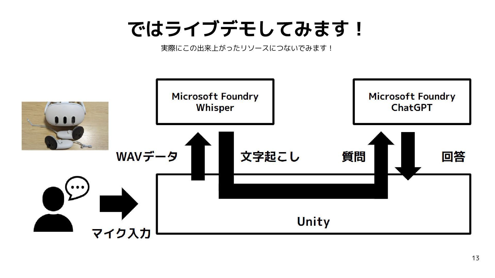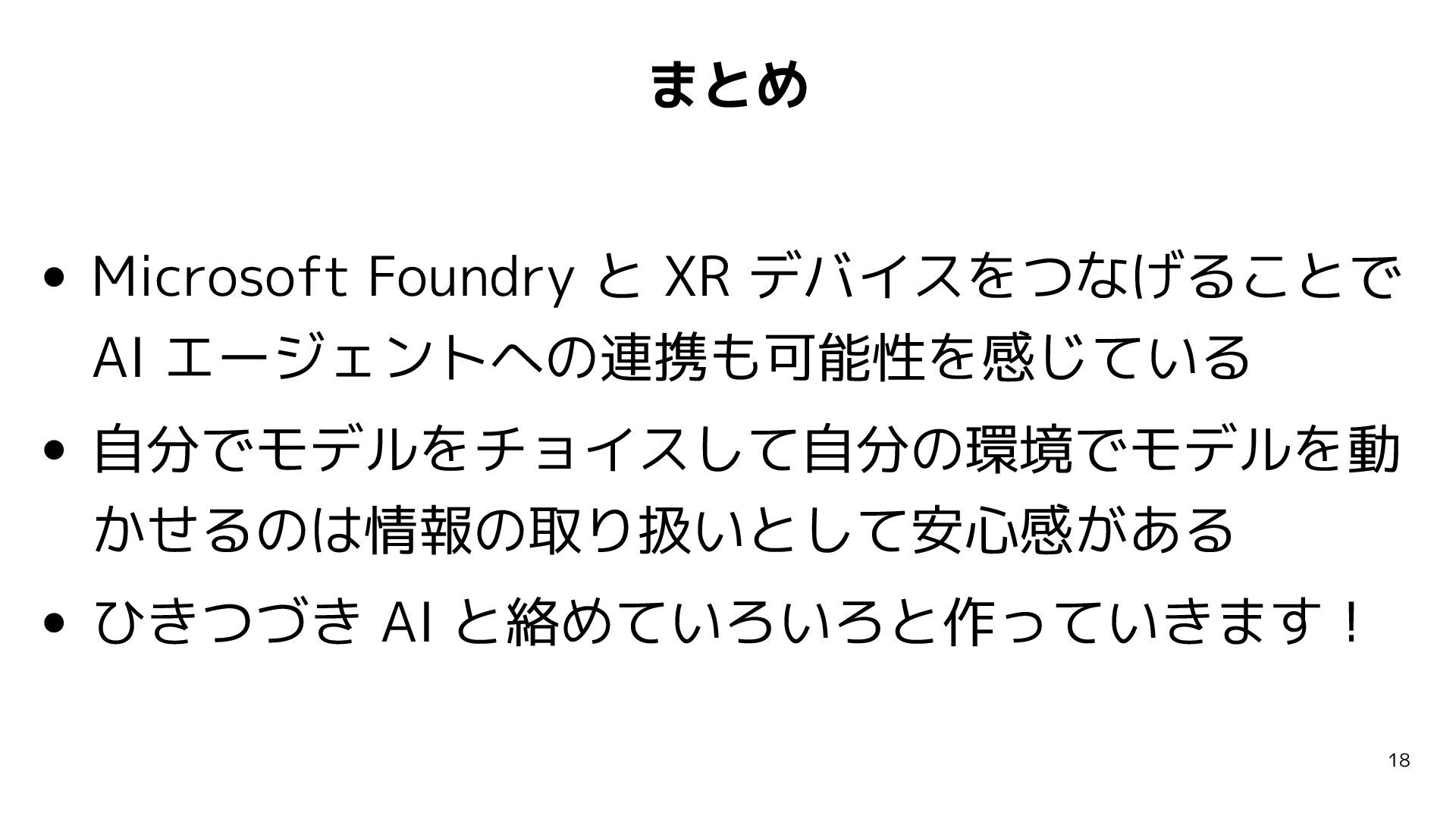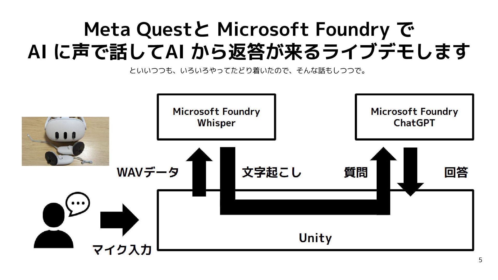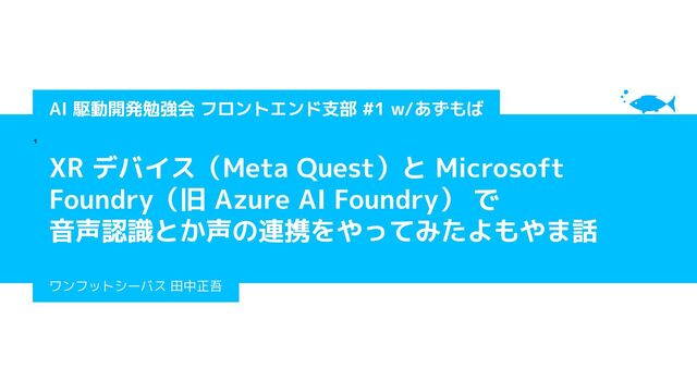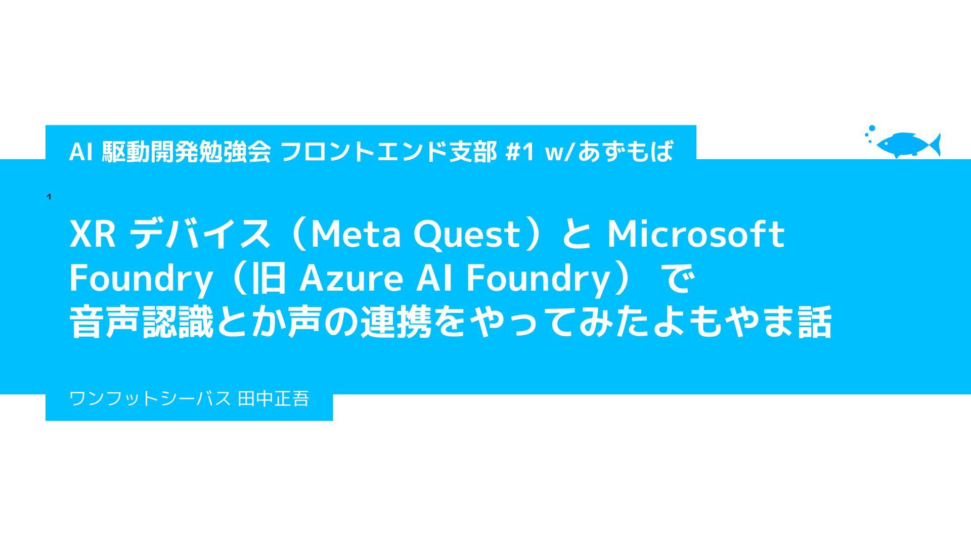 AI 駆動開発勉強会 フロントエンド支部 #1 w/あずもば「XR デバイス(Meta Quest)と Microfoft Foundry(旧 Azure AI Foundry)で音声認識とか声の連携をやってみたよもやま話」の登壇資料です。