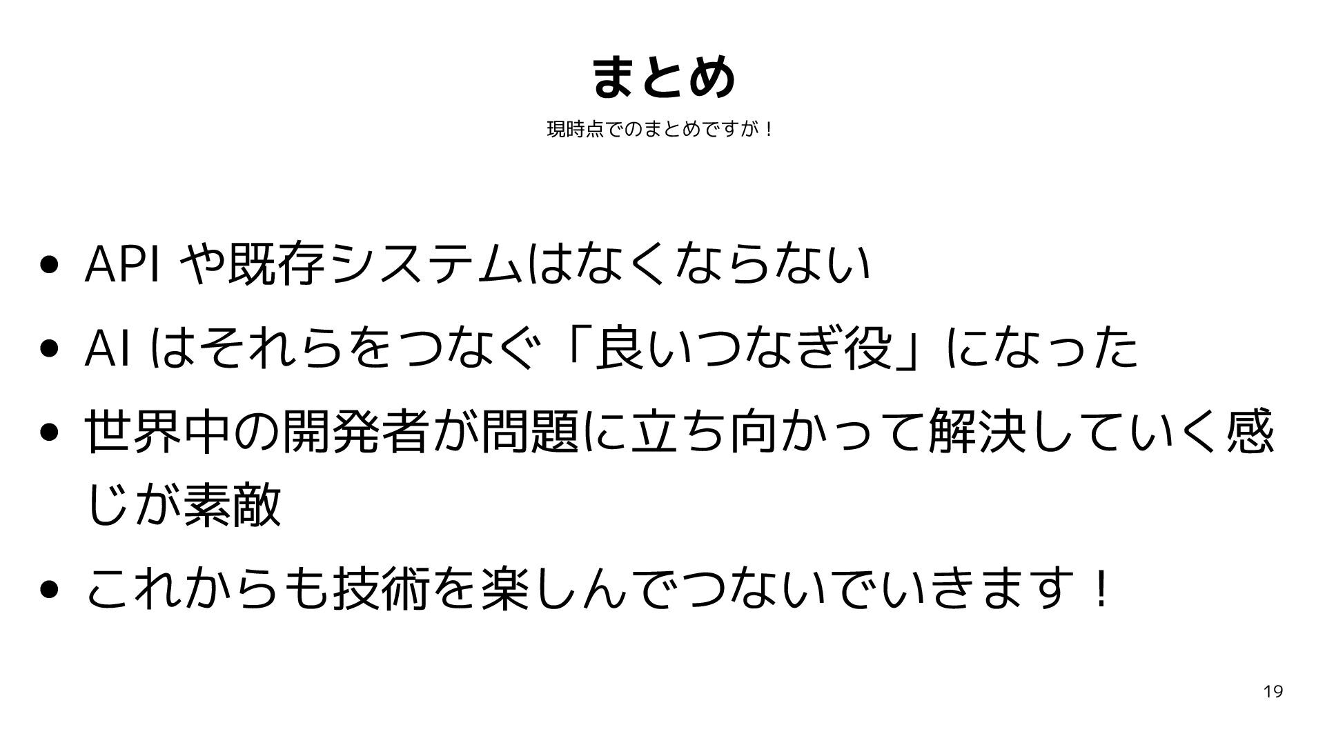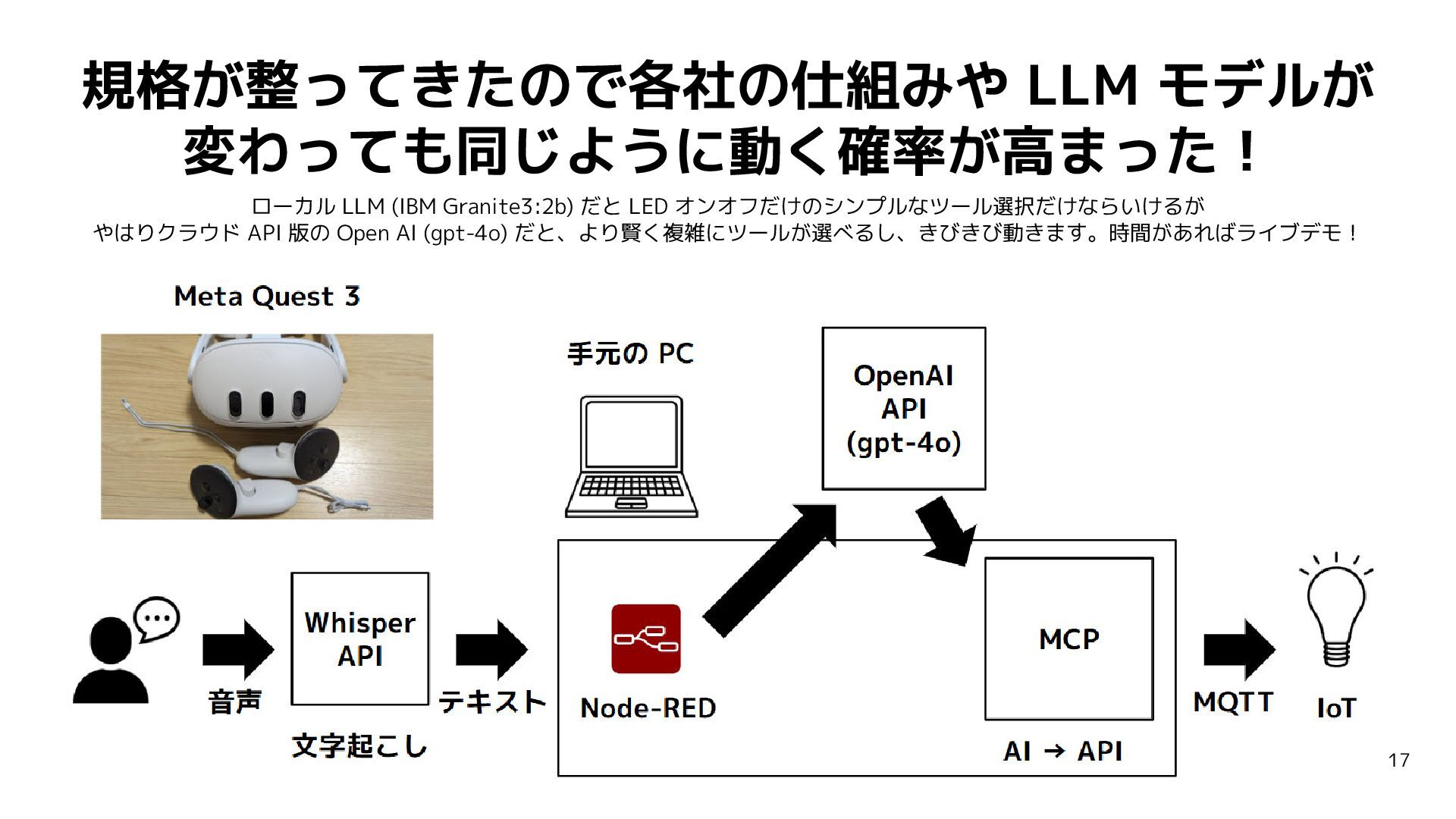 オンオフだけのシンプルなツール選択だけならいけるが やはりクラウド API 版の Open AI (gpt-4o) だと、より賢く複雑にツールが選べるし、きびきび動きます。時間があればライブデモ! 17