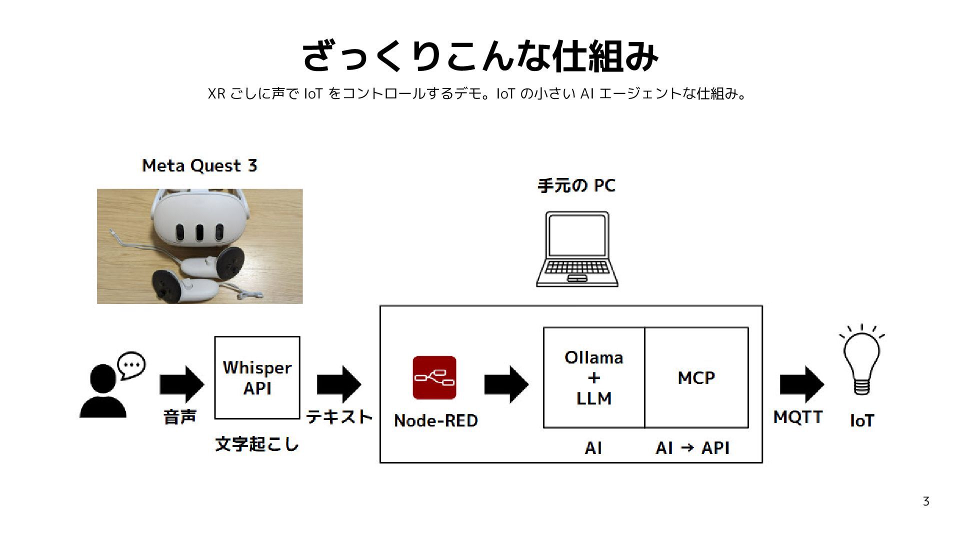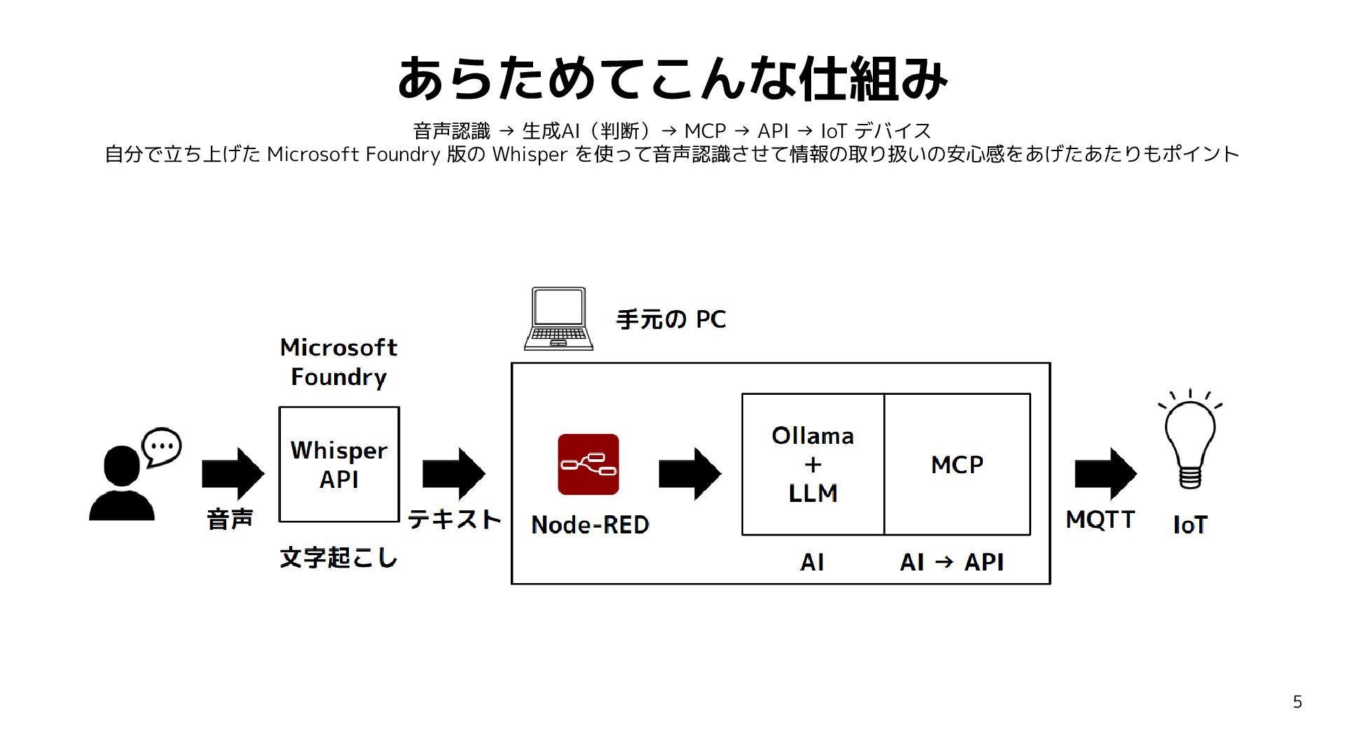 1. あらためてこんな仕組み 音声認識 → 生成AI(判断)→ MCP → API → IoT デバイス