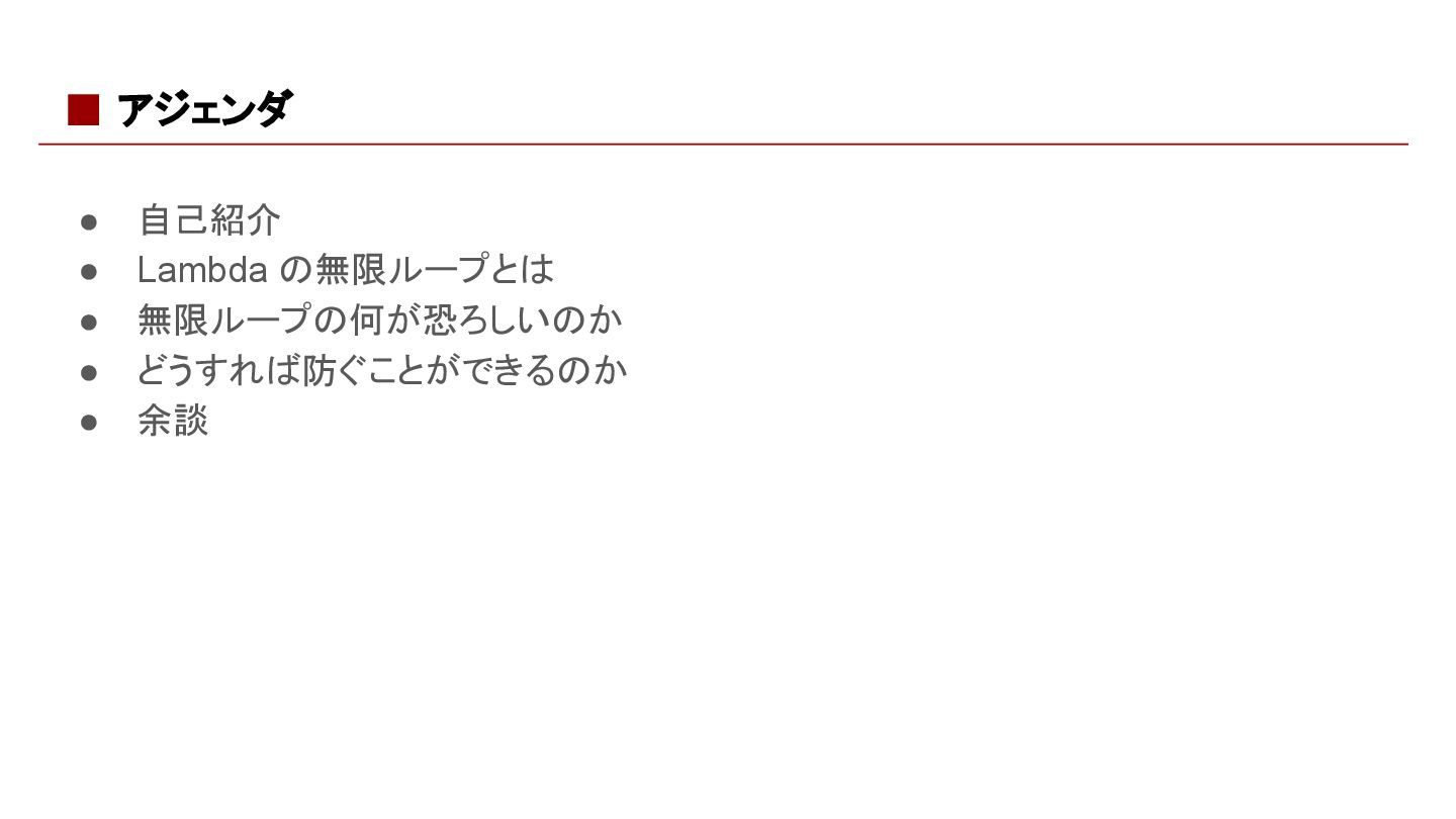 • 自己紹介 • Lambda の無限ループとは • 無限ループの何が恐ろしいのか • どうすれば防ぐことができるのか •