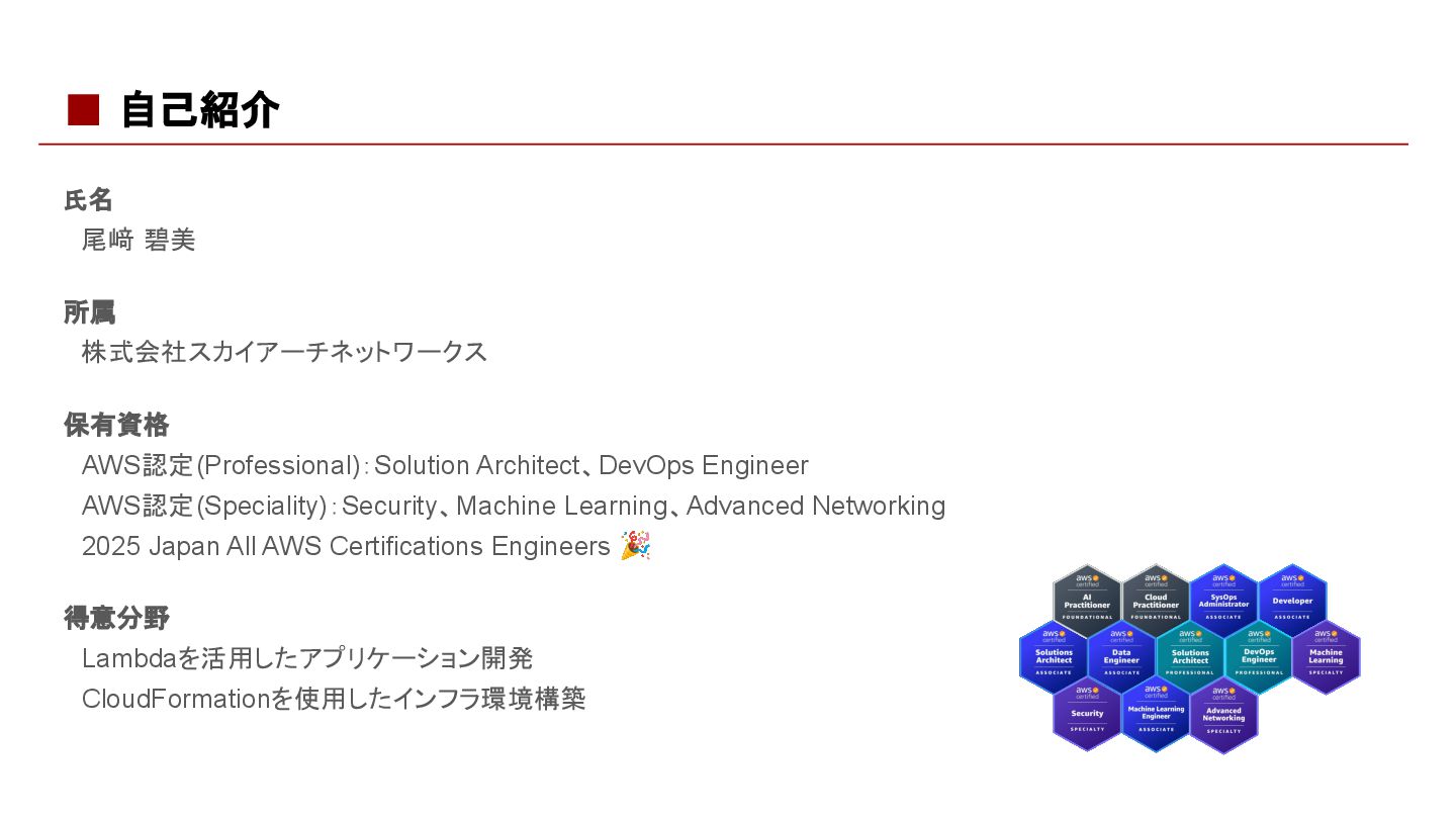 Engineer AWS認定(Speciality):Security、Machine Learning、Advanced Networking 2025 Japan All AWS Certifications Engineers 🎉 得意分野 Lambdaを活用したアプリケーション開発 CloudFormationを使用したインフラ環境構築