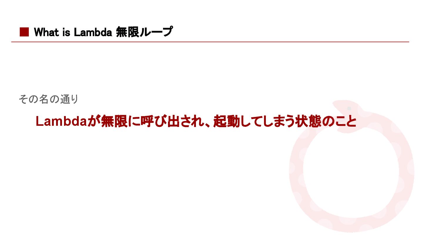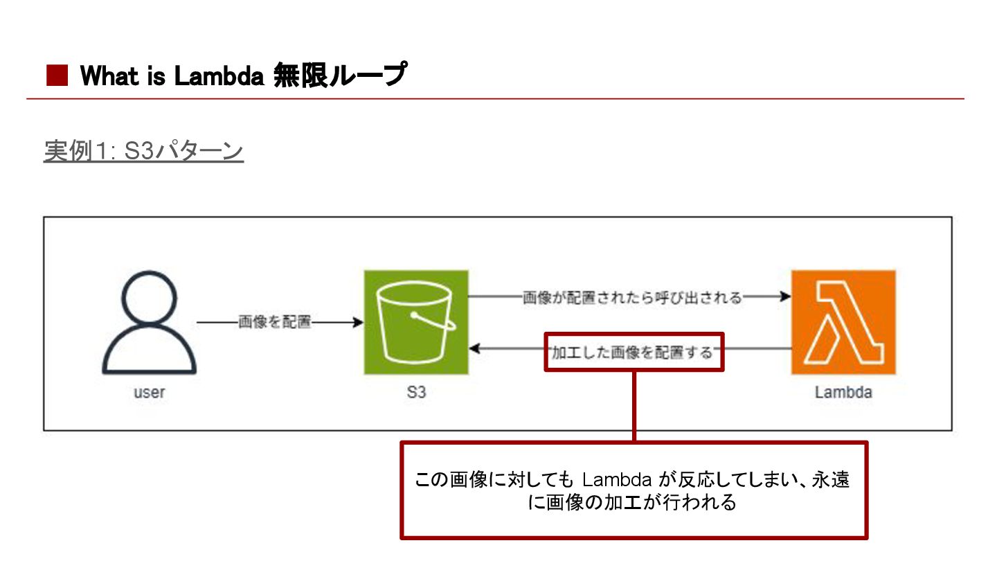 ▪ What is Lambda 無限ループ Lambdaが無限に呼び出され、起動してしまう状態のこと その名の通り