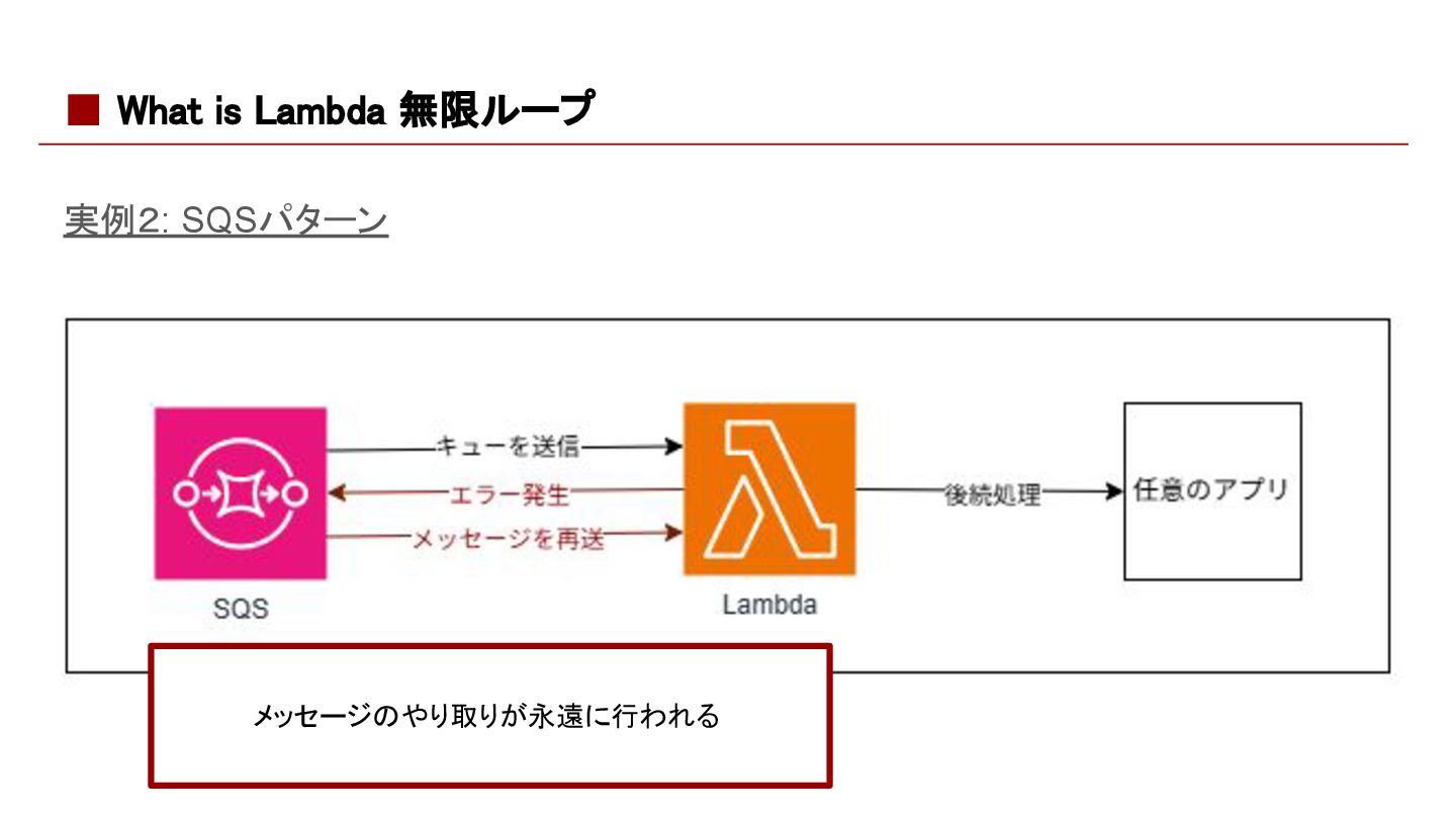 実例2: SQSパターン ▪ What is Lambda 無限ループ メッセージのやり取りが永遠に行われる