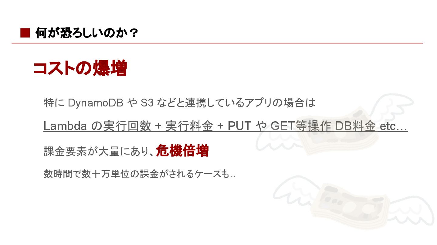 の実行回数 + 実行料金 + PUT や GET等操作 DB料金 etc… 課金要素が大量にあり、危機倍増 数時間で数十万単位の課金がされるケースも …