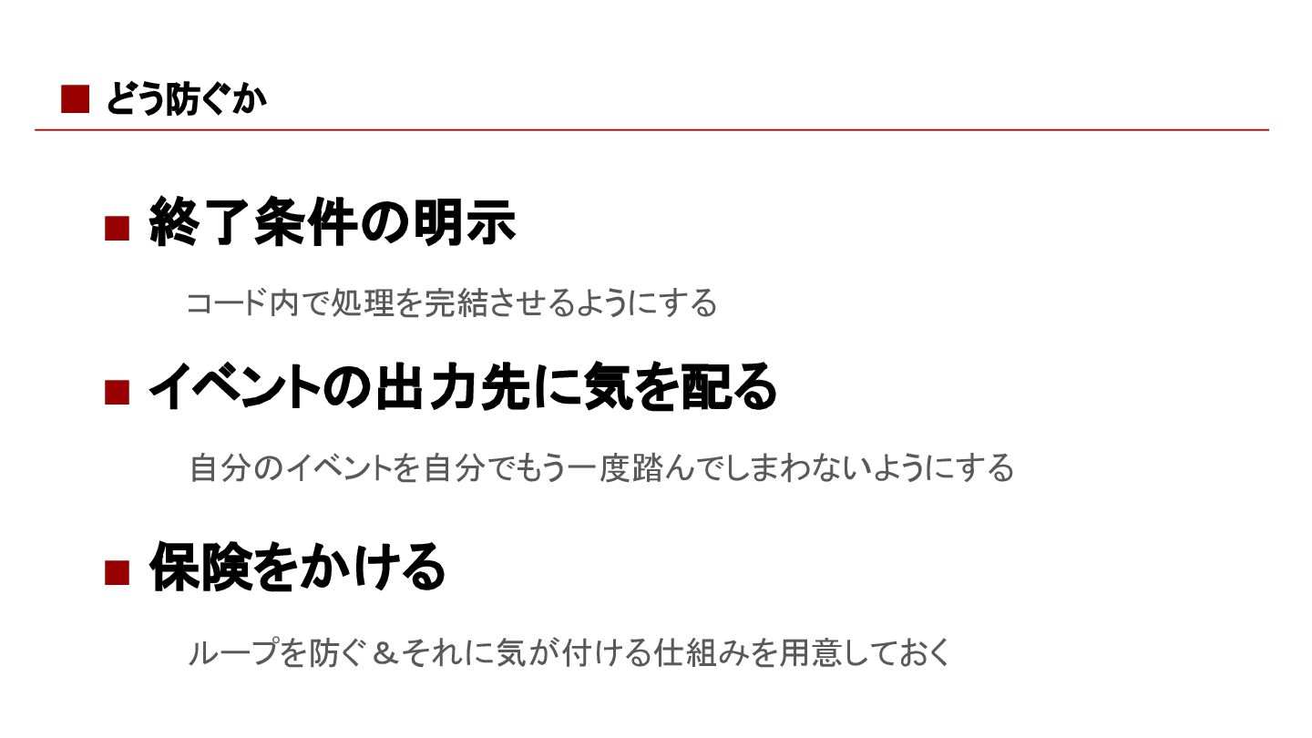 ▪ 終了条件の明示 ▪ どう防ぐか コード内で処理を完結させるようにする ▪ イベントの出力先に気を配る ▪ 保険をかける