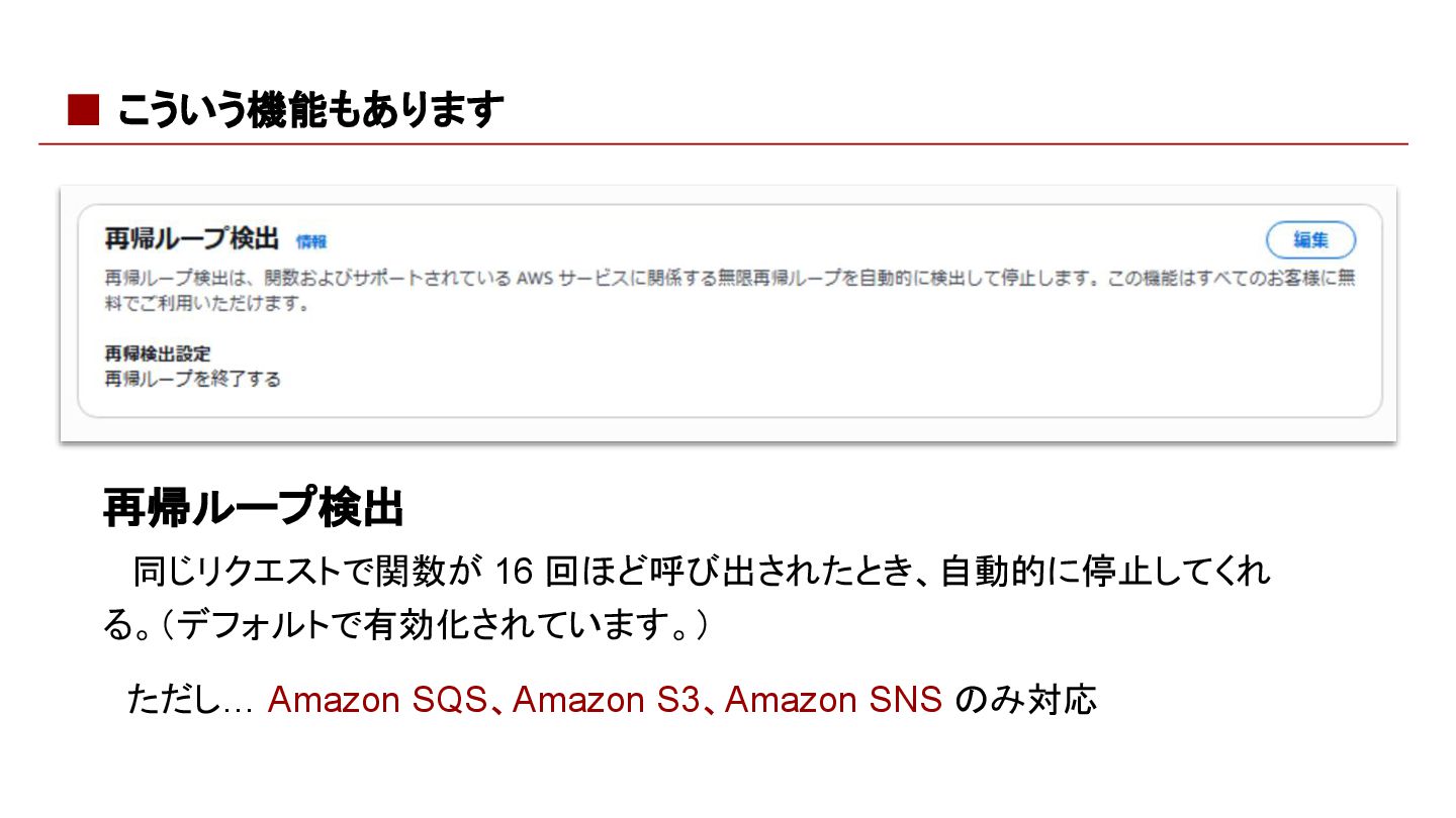 ▪ こういう機能もあります 再帰ループ検出 同じリクエストで関数が 16 回ほど呼び出されたとき、自動的に停止してくれ る。(デフォルトで有効化されています。) ただし… Amazon