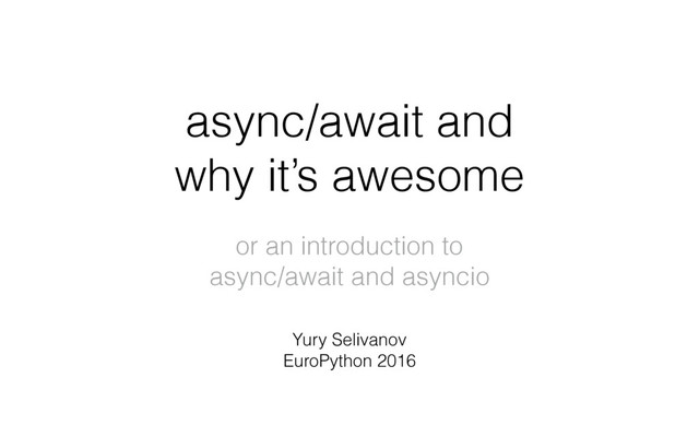 • New builtin type for coroutines. • New concepts: async for and async with. • Generic, framework agnostic design. • Fast: only ~2x slower than a function call. 10-100x faster than yield coroutines. Why async/await is the answer